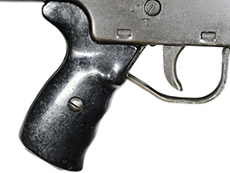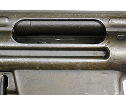 本品の金属部に関しましては、マガジンの着脱に影響は見られませんが若干マガジン・ハウジング左側面に凹みが見られ、所々退色してうっすら地金色になっている部分も多いのですが、大きな欠損、破損はみられず、実銃として使用されていた頃の面影を感じられる風合いです。 ゴム製のバット・プレートには経年によるヒビや磨耗が見られますが強度的に比較的しっかりとした状態が保たれています。