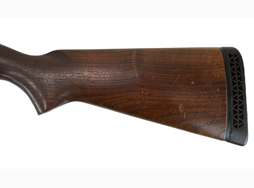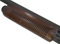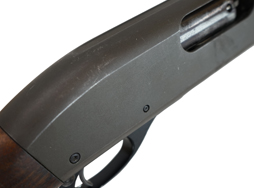 本品の機関部左側面にはシリアルNo.やレミントン社のロゴ、「Wingmaster MODEL 870」のモデル名の刻印が入っています。 また、銃身にはWARNINGの注意書きと共に「REMINGTON ARMS COMPANY.,INC. ILION,N.Y. MADE IN U.S.A.」のメーカー刻印の他、「12 GA. FOR 2 3/4 IN. SHELLS」の刻印が入っています。 本品は若干の擦れなどは見受けられるものの全体にパーカーの表面仕上げが大変良好に保たれています。 木製フォア・エンドやバット・ストックについても、やや打ち傷や線傷等は見受けられますが、こちらも目立った破損や欠損等は見られず、概ねしっかりとした状態が保たれています。 フォア・エンド左側面に僅かな欠けが見受けられるものの、大きく外観を損ねる物ではありません。 「Remington」のロゴの入ったゴム製のバット・プレート部についてもやや打ち傷はありますがこちらも良好な状態です。セフティ・ボタンを押し込むとトリガーがロックされます。 アクション・リリース・ボタンは押された状態になっています
