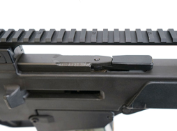 本個体のレシーバー左側面には、シリアルNo.85-031421に加えて、「HK G36CV Kal. 5,56mmx45」のモデル名刻印が入っています。 アッパー及びロア・フレームのシリアルNo.はマッチしています。 本体上面にはピカティニー・レールが装備されており、折り畳み式の前後バックアップ・サイトが内蔵されています。 セレクター表示はセミ/フル・オートマチック射撃に加えてバースト射撃ポジションが設けられています。
