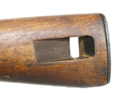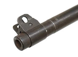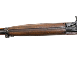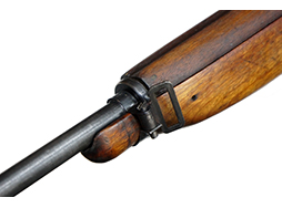 本品はレシーバーがQuality Hardware社で製造された個体で、レシーバー後端にシリアルNo.及びメーカーを示す刻印が見られます。 Quality Hardware社におけるM1カービンの生産数は359,666挺と限られており、M1カービンを最も多く生産したInland製の約2,625,000挺と比較すると珍しい個体と言えます。 また。その他の部品に他社の刻印が見られますが、Quality Hardware社は一部の部品のみ生産していたため違和感はありません。 本品の機関部はシリアルNo.から1943年2月〜9月頃の間に製造された個体であると考えられます。 また、銃身先端付近には一部薄くなっているものの、「BUFFALO ARMS 10-1943」及びフレーミング・ボム刻印が入っています。 Buffalo Arms社は実際にQuality Hardware社へ銃身を供給していた業者の一つで、製造時期も機関部とほぼマッチしています。 尚、薬室上のモデル名刻印は「U.S. CARBINE CAL. .30 M1」となっています。 各部の仕様としては、ボルトがフラット・タイプ、セーフティはプッシュ・タイプ、リア・サイトはPI刻印が入った削り出しのアジャスタブル・タイプの物が付いています。 トリガー・ハウジングについては「Q-NL」の刻印が入ったタイプで、こちらもQuality Hardware製の機関部とマッチしています。 銃床はイタリア軍放出のM2カービン用で、バット・ストック右側面にFAT刻印が入っています。 フロント・バンドについては、着剣ラグの無いタイプのリプロ品が取り付けられています。 アッパー・ハンドガードは「MU」の刻印が入ったナロー・グルーブ・タイプとなっています。