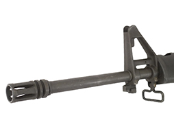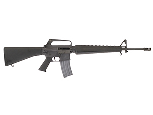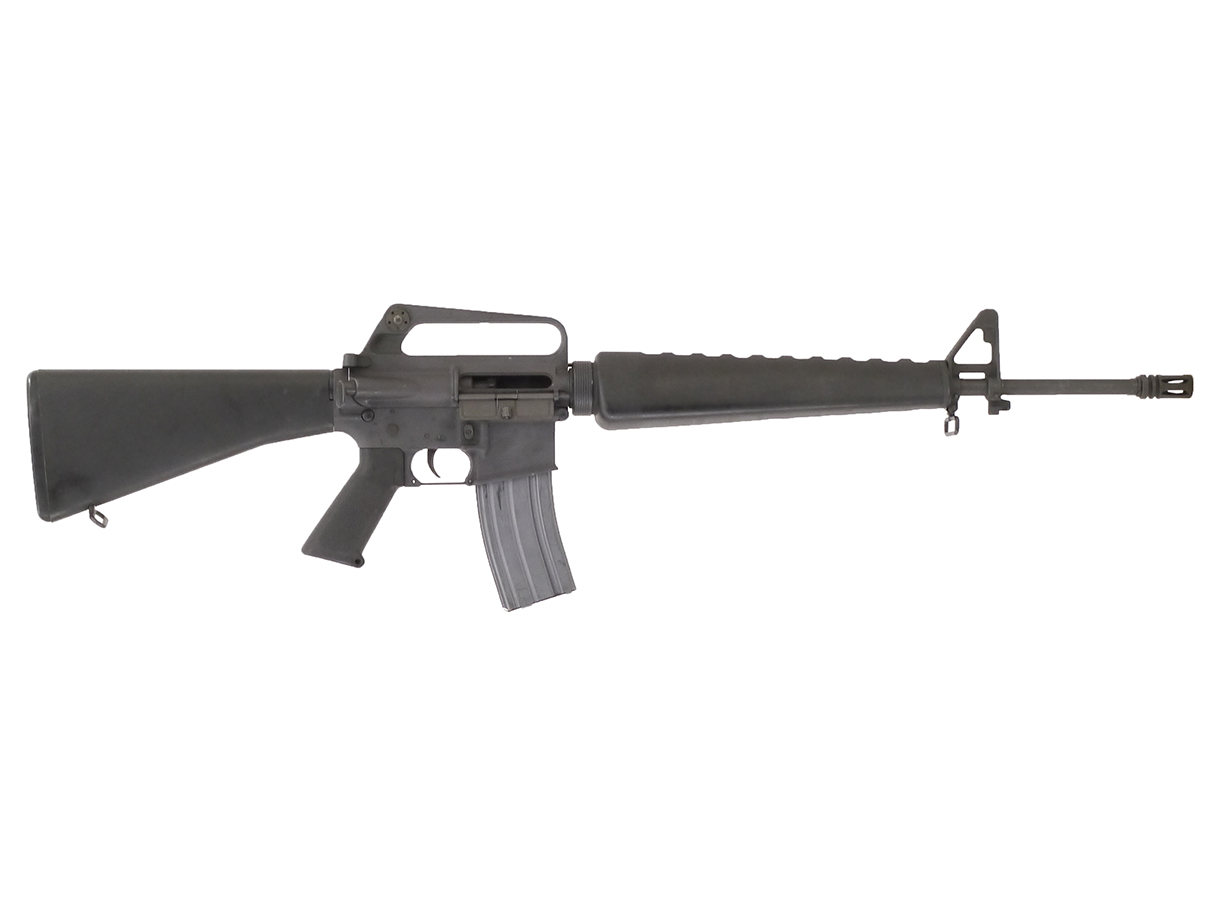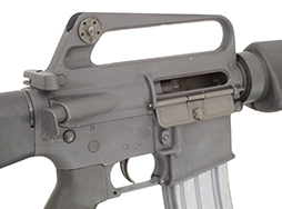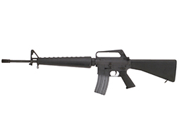 1950年代以降、第一次・第二次世界大戦で蓄積された膨大な戦闘報告書を基にした、戦場における小銃の殺傷能力に関する米英の共同研究により、従来の遠距離からの一撃必中を基本とした戦法よりも、軽量で兵士一人が大量に携行可能な小口径弾を高速で連射した方が効率的であるという理論が確立されました。 この条件を満たす自動小銃の研究開発が各社で開始され、殆どの案が従来型ライフルの域に留まる中、ユージン・ストーナー設計によるアルミ合金や強化樹脂を多用したAR-15自動小銃がその軽量さと連射時の操作性で注目を集めました。 AR-15は1962年に米空軍においてM16として採用されましたが、陸軍でも採用が検討され、米陸軍仮制モデルであるXM16E1が1965年からベトナムで実戦投入されました。 しかしながら、設計の意図と異なる装薬の使用や、一部製造工程の省略等により、致命的な動作不良が続出しました。 紆余曲折の末、1967年2月にそれまでの仮制式名であるXM16E1に代わり、改良モデルがM16A1の陸軍制式名が与えられて採用されました。 M16A1 (コルト社内モデル名M603) は、仮制式モデルであるXM16E1 (陸軍向けM602) と同様にボルト・フォワード・アシストを備えており、マガジンから薬室への装填不良が発生した際にもボルトを手動で前進させる事が可能となっています。 M16A1ではマガジン・リリース・ボタンの誤操作を防ぐ為のリブが追加された他、ボルトを始め内部部品が強化されました。 また、薬室内のクロム鍍金処理に加え、銃と一緒にクリーニング・キットと漫画形式の取扱説明書が配給されるようになって、ようやく駄作銃の汚名を払拭するに至り、その後に続くアメリカ軍主力小銃の基本となりました。 M16A1はベトナム戦争拡大に伴う大量の需要に応える為、コルト社以外にもゼネラル・モータースのハイドラ・マチック・ディビジョン及びハーリントン&リチャードソン社でも生産が行われました。 また、輸出向けとしても大量に生産され、これらの輸出向けM16A1にはM613のコルト社内モデル名が与えられました。 M16A1はその後のM16A2やM4カービンといった発展型の開発に繋がる基礎となりました。 M16A1は現在欧米市場でも入手が困難なアイテムの一つです。 (KK Updated)