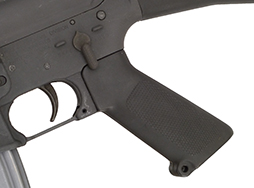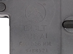 本個体はシリアルNo.9488521で、マガジン・ハウジング左側面にはシリアルNo.の他、「COLT M16A1 CAL. 5.56 MM.」のモデル名刻印やコルト社のロゴがはっきりと入っております。 シリアルNo.から、コルト社が70年代後半から80年代前半にかけて製造した軍用M16A1の最終輸出仕様である事がわかります。 その他、レシーバー左側面にやや薄くなっているものの、コルト社のアドレス刻印が入っています。 もちろんコマーシャル (民間用) 仕様ではないので、セレクターにフルオート・ポジションがあります。