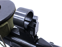 金属部はブルー仕上げが美しく残っており、使用感は少ない印象です。 管理上の小傷は若干見られますが、目立つような傷は殆ど見受けられません。 銃身に溝の無いタイプとなっており、キャンバス製のカバーはグリースの染みも一部見られますが、劣化は少なくしっかりとした状態です。 溝のある木製のピストル・グリップには若干の打ち傷や擦れが見られますが、良い状態を保っています。 二脚はスムーズに開閉でき、蝶ネジを締めこむと銃本体に固定されますが、その蝶ネジが大変固くなっています。 リア・サイトは距離を調整でき、テンションがはっきりと残っているキャッチを操作することで、スムーズに切り替える事ができます。 マガジンは非常にタイトにはまっており、マガジン・キャッチの操作し辛さと着脱が非常に固いですが、同時に使用感の少なさが窺えます。 伸縮式のストックはスムーズに伸縮でき、各ポジションでしっかりとロックされます。 照準器用のマウント・リングのある個体です。