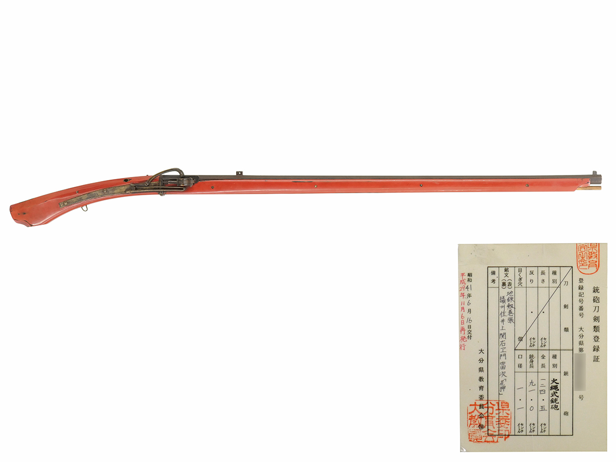 昭和41年6月16日(平成29年11月6日再発行)に大分県教育委員会によって交付された銃砲刀剣類登録証が付いた完全可動する実物の古式銃です。 無可動実銃ではありません。