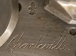 本品は復刻品のシャルルビル Mle 1766 マスケットを無可動加工した品です。 ロック・プレート部には「Charleville」の文字が筆記体により入っている他、フルール・ド・リス (百合の紋章) の刻印が打刻されています。