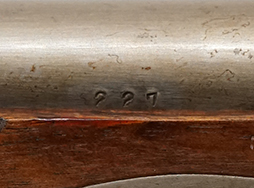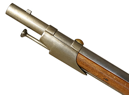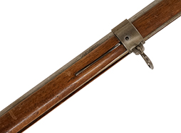 白磨きの銃身や機関部は、若干のくすみや僅かな表面錆が散見されるものの、目立った欠損等は見られず、比較的良好な状態が保たれています。 各部の取り付けについても現状目立ったがたつき等は見られず、しっかりとしています。 木製銃床はやや明るい色合いのニス仕上げとなっており、全体に適度な使用感が表れており、やや小傷や擦れ、一部仕上げの剥落が見られますが、大きな破損等は見受けられません。 バット・プレート部分についても一部表面錆が見られる程度で、白磨きの比較的良好なコンディションが保たれています。 撃鉄 (コック) はトリガーとの連動はありませんが前後に動きます。 当たり金 (フリズン) の開閉についても問題なく、しっかりとしたテンションがかかっています。 トリガーテンションはありません。 さく杖が付属いたします。 (KK)