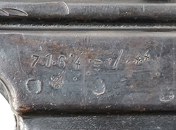 本品のレシーバー左側面には「MP44」のモデル名刻印が入っており、アッパー・レシーバー左側面にはシリアルNo.の後方に「/44」の刻印が入っている事から、本品が1944年に製造された事が判ります。 マガジン・ハウジング前方のレシーバー下面にはやや判読が難しいものの、Steyr-Daimler-Puchを示す「bnz」の刻印が入っています。 各部のシリアルNo.は、バット・ストックが4018で、ストック基部は打ち直しにより4018となっています。 ストック基部下面にはMerz-Werke Gebr社を示す「cos」、トリガーにCarl Eickhorn製を示す「cof」、フロント・サイト・ベース前面にJ.P. Sauer & Sohn社を示す「ce」の刻印が入っています。 その他、各部にアムト刻印も確認できます。