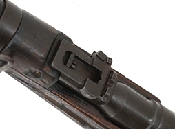 本品のシリアルNo.は83445で、機関部左側面にはシリアルNo.及び名古屋工廠製を示す刻印の他、<ホ>のシリーズ刻印が入っています。 その他、上帯下部に機関部とマッチした「445」の番号が入っています。 薬室上面の「三八式」のモデル名刻印ははっきりと残っていますが、菊花紋章は削られています。 照星は前中後期型に共通するガードが付いており、安全子は窪みの有る後期型、床尾板もカップ型の後期型です。 照門は前〜後期共通のVノッチ型です。