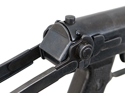 本品の金属部には若干の小傷や擦れが見受けられるものの、大部分にオリジナルのブルー仕上げが残った概ね良好な状態が保たれています。 アッパーとロア・レシーバーの分割基部ピン付近左面に打ち傷に伴う凹みが見られますが、その他の箇所では大きな凹みや変形は見られません。 レシーバー右面には黒いペイントにてレタッチした跡が1箇所見られますが、あまり目立たない程度です。 アッパー・レシーバー上面には銃の構造上致し方ない部分ですが、ストックを折り畳んだ際にバット・プレートが当たって出来た小傷が見られますが、錆や腐食は見られません。 黒色樹脂製のグリップ・パネルには若干の小傷や擦れが見受けられるものの、大きな破損の無い状態が保たれており、銃本体にガタつきなくしっかりと取り付けられています。 ストックの展開/収納、マガジンの着脱、リア・サイトの切り替え、レシーバーのテイクダウン操作等については問題なく行う事が可能です。 折り畳みストックは展開時にごく僅かなガタつきも見られますが、十分許容範囲内で、ストックの展開/収納はスムーズに行うことが可能です。 付属のマガジンは表面に小傷や擦れが見られるものの、大きな破損や変形等は見受けられず、オリジナルのブルー仕上げが残った良好な状態が保たれています。 ボトム・プレートに僅かな変形が見られますが、ベース・プレートとの勘合にも問題はなく、機能的な問題も見られません。 尚、マガジン・スプリングは入っています。