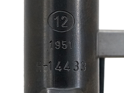 本品はシリアルNo.H-14433の個体で、レシーバー上面にはシリアルNo.の他に製造年を示す「1951」の刻印及びポーランドのBaildon製鋼所製を示す楕円の中に数字の12が入った刻印が打刻されています。 シリアルNo.はレシーバーとコッキング・ハンドルでマッチしています。
