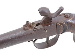 本品の銃身を含む鉄部は黒錆に覆われていますが、これは当時の日本における防錆方法であった錆付けによるもので、欧米のようにブルー仕上げがなかった日本では一般的なものでした。 銃身にはやや表面錆痕や経年による褪色が見られるものの、現状大きな欠損等は見られません。 木製のグリップについても、若干の打ち傷や線傷が散見される他は目立った割れや欠け等は見られず、こちらも製造された時代を考慮すれば比較的良好な状態が保たれています。