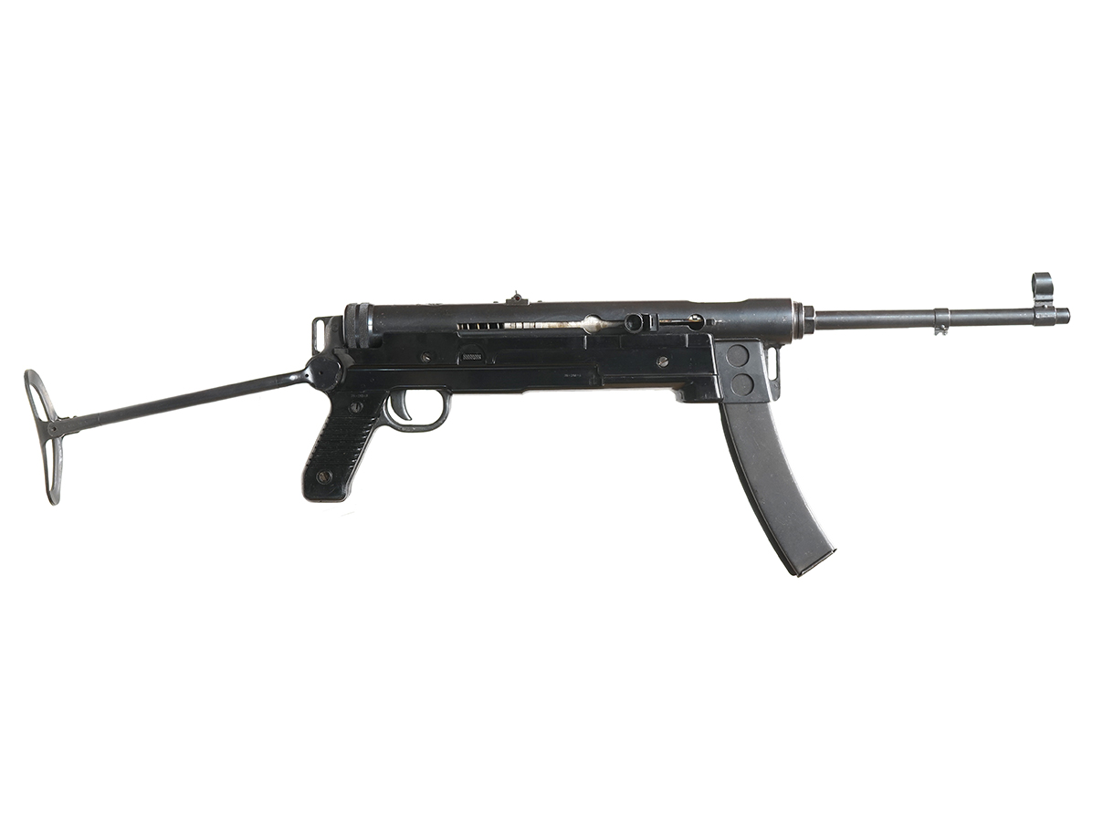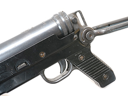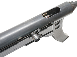 樹脂製ハンドガードやフォールディング・ストック等にドイツのMP40短機関銃の影響を強く受けていますが、コッキング・ハンドルの位置変更やバナナ・マガジンの使用、バヨネット・ラグの追加といった独自の改良も多く見受けられます。 作動方式はオープン・ボルト位置から射撃を開始するブローバック方式で、ロア・フレームに設けられたセレクター・ボタンによりセミ/フル・オートマチック射撃の切り替えが可能です。 コッキング・ハンドルには、ボルトが前進した状態で本体を誤って落下させた際の暴発を防止するレバー式のロック機構が組み込まれている他、コッキング・ハンドルを時計回りに90度回転させる事により、ボルトを前進もしくは後退位置で固定するマニュアル・セーフティも装備されています。 リア・サイトは100mと200mの切り替えが可能なフリップ式となっています。 (KK Updated)