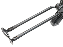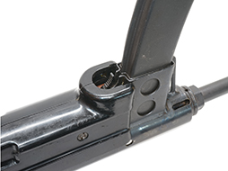 本品の金属部は全体にやや小傷や擦れは見受けられるものの、目立った破損や欠損等は見受けられず、比較的良好な状態が保たれています。 樹脂製のハンドガードやグリップについても同様に、やや打ち傷や擦れ等は見られますが、こちらも目立った割れ等は見られず、しっかりとした状態が保たれています。 レシーバー下面の左右の樹脂製ハンドガード合わせ目にやや隙間が見られますが、取り付け自体はがたつきもなくしっかりとしています。 折り畳み式ストックの展開に問題は見られず、遊びについても十分許容レベルです。 リア・サイトの切り替えは非常に固くなっています。 マガジンの着脱については問題なくスムーズに行う事が可能で、装着時のガタつきも最小限です。 付属のマガジンについては若干の小傷や擦れは見られるものの、目立った凹みや変形等は見られません。 尚、マガジン・スプリングは入っていません。