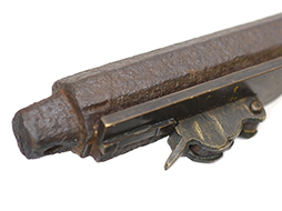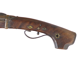 長州堺 (現在の山口県) で製作された長州筒です。 無銘ですが外見的な特徴から長州で製造された事が判ります。 口径が二匁目玉から三匁目五分玉程度の細筒に銃身や台木など全体に豪華な装飾が施された物が多く見られます。 これらの火縄銃は主に狩猟や射的用として製造されました。
