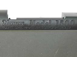本個体は7,62mm×39弾仕様のモデルで、薬室部右側面にはシリアルNo.刻印、銃身右面に使用弾薬を示す「7.62x39」の刻印が見られます。 機関部左側面には「Howa Model 1500」のモデル名刻印や「MADE IN JAPAN」の刻印、インポーターの刻印が入っています。