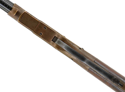 本品のリア・サイト後方の銃身上面にはシリアルNo.8267が打刻されており、このシリアルNo.から本品が1865年に製造された品である事が窺えます。また、リア・サイト前方の銃身上面には「HENRY'S PATENT OCT. 16. 1860」のパテント刻印と「MANUFACT'D BY THE NEW HAVEN ARMS CO. NEWHAVEN, CT.」のアドレス刻印が二行にわたってはっきりと入っています。 本品はヘンリー・ライフルとしては後期の生産品のため、バット・プレートの角は尖った形状となっており、レシーバーは上面にリア・サイト取り付け用のアリ溝が設けられていない仕様となっています。