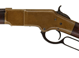 ウィンチェスター社はオリバー・ウィンチェスターにより創業された元繊維会社で、1857年に独自のレバー・アクション構造のパテントを持っていたボルカニック リピーティング・アームズ社の武器製造工場を買収したのが銃器産業に参入する切っ掛けとなりました。 当初はニューヘイヴン・アームズ社として創業し、ヘンリー ライフルとして知られるボルカニックの進化型であるレバー・アクション ライフルの製造権を取得すると、オリバーの息子であるウィリアムにより全米で販売を開始しました。 そして1866年にウィンチェスター社として改名後は、工場長であったネルソン・キングのパテントによりヘンリー ライフルの欠点であったマガジンを改良し、フレーム右側面のローディング・ゲートから弾薬を装填出来るようにしました。 更にハンド・ガードを追加する事により、連続射撃による銃身の過熱から手を守る工夫などの改良を施した「M1866」を発売しました。 この銃はフレーム全体が真鍮製 (砲金製="bronze alloy" または "gun metal") であることから「イエローボーイ」と一般的に呼ばれています。 一世紀半の時を経て金色に輝いていたフレームがまさに「イエロー」と呼ばれる色合いになった貴重な品も弊社には入荷しています。