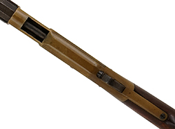 本品の銃身やアンダー・レバーといった鉄部は、やや打ち傷や経年による褪色、若干の時代錆は見られるものの、大きな欠損等は見られず、概ねしっかりとした状態が保たれています。 砲金製のレシーバーについては、若干の打ち傷等を除いて目立った腐食等は見られず、適度な時代が付いた良い雰囲気となっています。 オリジナルのウォールナット製のハンドガードやバット・ストックについては、やや打ち傷や線傷が見られる他、ハンドガード先端に一部ひびの補修痕が見受けられ、バット・ストック取り付け基部に僅かに欠けが見られるものの、それ以外に大きな破損等は見られません。 傷み易いバット・プレートについても、やや打ち傷は見受けられるものの、目立った腐食や変形等は見られず、銃床への取り付けもがたつきもなくしっかりとしています。 ストック内コンパートメントの蓋の開閉については問題なく行う事が可能です。