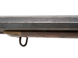 本品は米国ウィンチェスター社製オリジナルのM1866 イエローボーイ ライフル 2ndモデルです。 ウィンチェスター M1866 イエローボーイ カービンは、1stモデルから4thモデルへと改良されるに従って、ヘンリー ライフルから受け継いだ特徴が徐々にイエローボーイ独自の形状に変化しました。 ハンマー前方のフレーム後部のカーブは、ヘンリー ライフルでは一旦急なカーブを描いて落ち込み、顕著なくびれを経て銃把部分へと繋がるHenry Dropと呼ばれるデザインでしたが、イエローボーイでは改良されるに従ってHenry Dropの面影が薄くなり、次第になだらかな形状となります。 本品は2ndモデルで、フレーム後部の形状は1stモデルに比べてなだらかになっていますが、Henry Dropと呼ばれるヘンリーの面影は比較的残っています。 本品のフロント・サイトは頂部が真鍮製となった鉄製のブレード・タイプで、アリ溝により固定されています。 リア・サイトはステップ・エレベーターにより調整可能なセミ・バックホーン・サイトが取り付けられています。 本品の銃身上面には「WINCHESTER'S REPEATING ARMS. NEW HAVEN. CONN U.S.A」のメーカー・アドレス刻印及び「-KING'S IMPROVEMENT PATENTED MARCH 29. 1866. OCTOBER 16. 1860.-」のパテント刻印が二行にわたって入っています。 シリアルNo.はロア・タングに打刻されていますが、バット・ストックを取り外した状態でのみ確認出来るようになっています。 このような打刻方法は、シリアルNo.が概ね21,000までの個体に見られます。 尚、ハーフ・コック機能はシリアルNo.が23,000以降から導入されたため、本品もハーフ・コック機能を元々備えていません。