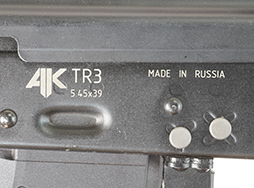 レシーバー左側面には「AK」のロゴや「TR3」のモデル名、「5.45x39」の口径表示、「MADE IN RUSSIA」の製造国表示が見られます。