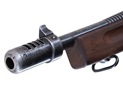 本品のレシーバー左側面にはシリアルNo.の他、「U.S. MODEL 1928 A1」及び「THOMPSON SUBMACHINE GUN CALIBRE .45 AUTOMATIC CARTRIDGE」の刻印が入っています。 また、レシーバー右側面には米国のパテント刻印の他、「AUTO-ORDNANCE CORPORATION BRIDGEPORT, CONNECTICUT,U.S.A」の刻印が入っています。 尚、レシーバー上面にはトンプソンのロゴが入っています。 ロア・レシーバーのシリアルNo.はアッパー・レシーバーのシリアルNo.とマッチしています。 本品はシリアルがAOで始まる事からオート・オードナンス社製であることがわかります。 バレル・フィンがあり、Lyman (ライマン) 社製のラダー・サイトが付いた仕様です。 カッツ・コンペンセーター表面の刻印についてもはっきりと残っています。 尚、セレクター及びセーフティはいずれも削り出しタイプの物が取り付けられています。