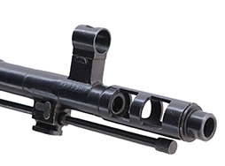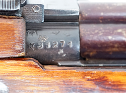 本品の薬室上部には、製造年を示す「1941」及びイジェフスク造兵廠の刻印が入っている他、薬室左側面にはシリアルの刻印が入っており、金属部には多数の検印が打たれています。 その他シリアルNo.は、ボルト・キャリア、トリガー・ガード、ストックと確認できた部分は一致しています。 本品はフラッシュ・サプレッサーが4本の広い窓が開いた後期型、レシーバーは後部にスコープ・マウント用のレール(溝)があるタイプとなっています。 ただし、レシーバー・エンド上部にスコープ・マウント固定用の半月状の溝が刻まれていません。
