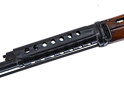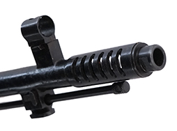 本品の薬室上部には、判読し辛くなっていますが製造年を示す「1940」及びイジェフスク造兵廠の刻印が入っている他、薬室左側面にはシリアルの刻印が入っており、金属部には多数の検印が打たれています。 その他シリアルNo.は、ボルト・キャリア、トリガー・ガード、ストックと確認できた部分は一致しています。 本品はフラッシュ・サプレッサーが6本の狭い窓が開いた前期型、レシーバーは後部にスコープ・マウント用のレール(溝)があるタイプとなっています。 ただし、レシーバー・エンド上部にスコープ・マウント固定用の半月状の溝が刻まれていません。