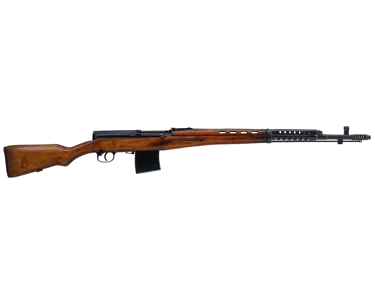 作動方式はショート・ストローク・ピストンによるガス圧利用式で、ティルティング・ボルト方式の閉鎖機構を備えており、モシンナガン小銃と同じ7,62mm×54R弾薬を使用します。 弾薬の装填はマガジン交換の他、モシンナガン小銃用の5発クリップを用いて本体上部から行う事も可能でした。 本銃は使用弾薬の性能や給弾不良等の問題を抱えていた他、モシンナガン小銃に比べて製造コストが高く、更に初歩的な訓練を受けただけの兵士にとっては構造が複雑でメンテナンスが難しい銃でした。 そのため徐々に生産数が減らされ、1945年初頭には生産が終了しました。 SVTには狙撃銃として使用する為、PUスコープを装着出来るバリエーションも約5万挺製造されました。 また、バリエーションとしてフル・オートマチック射撃が可能なセレクティブ・ファイアのAVTが存在しましたが、耐久性等に問題があったため少数の生産に留まりました。