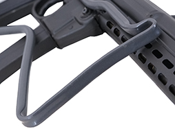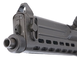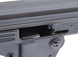 本品は全体に若干の使用感が見受けられ、スリング・スイベル付近を中心に金属部表面に小傷や擦れが見られるものの、目立った破損や変形等は見受けられず、大部分に表面仕上げが残った比較的良好な状態が保たれています。 折り畳みストック表面のグレー色のコーティングについても、擦れや小傷は見られますが、大きな剥落やヒビなどは見られず、しっかりとした状態が保たれています。 樹脂製のグリップ・パネルについても若干の打ち傷が見られる程度で、目立った割れや欠け等は見られず、良好な状態が保たれています。 マガジンの着脱やストックの展開及び折り畳み操作については問題なく行う事が可能です。 ストックは展開時のガタつきも殆ど見られずしっかりとしています。