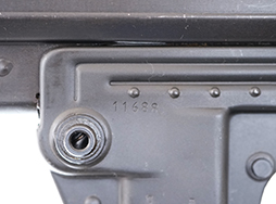 本品のシリアル No.は11688で、レシーバー左側面にシリアルNo.やフランス・マニューリン製を示す「MPL MANURHIN-MULHOUSE (FRANCE) Cal.9mm」が入っている他、マガジン・ハウジング左側面にはマニューリン社のロゴが打刻されています。 シリアルNo.はアッパー及びロア・レシーバーでマッチしています。