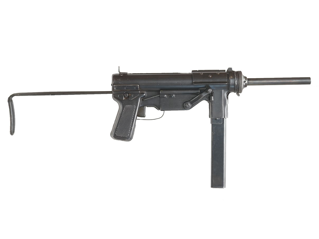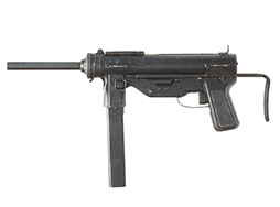 1942年12月に「U.S. SUBMACHINE GUN Cal.45 M3」としてアメリカ軍に制式採用された短機関銃です。 それまでのトンプソンM1928やM1短機関銃は鉄材の切削加工が多くコストがかかった他、重量も重かった為、プレス加工・電気溶接を多用し生産性を高め低コストな短機関銃を目指して開発されました。 発射サイクルもトンプソン短機関銃の700発/分から350〜450発/分程度に落とされ、射撃時の制御が容易になっています。 M3短機関銃の製造はゼネラルモータース傘下のガイドランプで行われました。 「グリースガン」の愛称は、本体形状が当時米軍用車両に装備されていたグリース・オイル注入容器に似ている事に由来します。 M3短機関銃の本体右側面には特殊なクランク型のコッキング・ハンドルが設けられているのが特徴です。 M3短機関銃は当初マガジン・キャッチにガードが設けられておらず、マガジンの脱落事故が発生したため、後期生産型ではマガジン・キャッチ周囲にガードが設けられるようになりました。 また、リア・サイトの両側に強化用のリブが追加される等の改良も行われています。