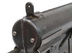 本品は全体に若干の使用感が見られ、打ち傷や擦れ、経年による表面仕上げの褪色の他、一部に金属の地肌が表れている箇所が見られるものの、目立った欠損等は見られず、概ねしっかりとした状態が保たれています。 銃身には細かな表面錆痕が見られるものの、大きな朽ち込み痕等は見られません。 銃身に大きな歪み反りは見られません。 マガジンの着脱やワイヤー・ストックの伸縮、エジェクション・ポート・カバーの開閉については問題なく行う事が可能です。 また、欠品しやすいエジェクション・ポート・カバー内のフェルトについては3割ほどの面積で残っています。 付属の30連マガジンには「SPW GL C-153427」の刻印が入っており、若干の小傷や擦れは見られるものの、目立った変形等は見られず、ブルー仕上げも比較的良好に残っています。 尚、マガジン・スプリングは入っています。