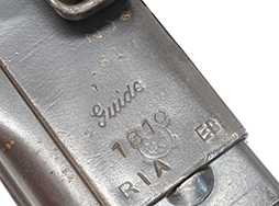 本品はマガジン・キャッチにガードが装備されており、リア・サイト両側が強化されていない仕様のM3 短機関銃です。 ワイヤー・ストックはマガジン・ローダー機能の無いオリジナルのM3タイプの物が付いています。 本品のマガジン・ハウジング左側面には、一部薄くなっているものの「SUB-MACH GUN CAL.45 M3」のモデル名刻印の他、シリアルNo.やガイドランプのメーカー刻印、米国武器省 (Ordnance Department) の検査刻印である「クロス・キャノン」の刻印が入っています。 シリアルNo.の下にはロックアイランド造兵廠にて再整備が行われたことを示す「RIA」の刻印と、1946年〜58年にロック・アイランド造兵廠で検査官を担当していたErnest Blindのイニシャルである「EB」の刻印が見られます。 その他、トリガー・ガード下部には「B・301456ITG」の刻印が入っており、ハウジング・アッセンブリー下部には「G.L. C 153432」の刻印が打刻されています。
