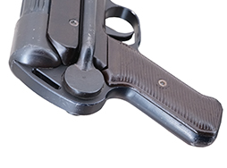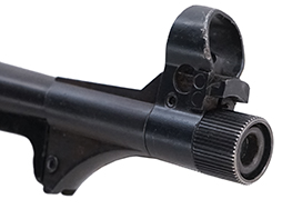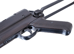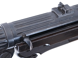本品の銃身や機関部、ストックといった鉄部は、やや打ち傷や擦れ、若干の経年による褪色が見られるものの、大きな欠損等は見られず、オリジナルのブルー仕上げも比較的良好に残っています。 フロント・サイト・ガードに僅かに歪みが見られますが、あまり気にならないレベルのものです。 MP38特有のアルミ製のグリップ・フレームは、黒色の塗装仕上げとなっており、やや打ち傷が散見されるものの、現状目立った腐食等は見受けられません。 ベークライト製のハンドガードとグリップ・パネルは色合いもほぼマッチしており、全体にやや打ち傷や線傷は見られるものの、大きな破損等は見られず、全体としては概ねしっかりとした状態が保たれています。 アッパー・レシーバーとロア・レシーバーの取り付けは、やや遊びが見られます。 折り畳み式のストックについては、折り畳み時及び展開時に遊びも比較的少なく、ロックもしっかりと掛かります。 尚、バット・プレートの折り曲げ操作やリア・サイトの切り替えはやや固くなっています。 マガジンの着脱については問題なく行う事が可能です。