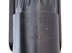 付属のマガジンはリブのないタイプで、「M.P.38u.40」及び1940年C.G.ハーネル社製を示す「122 40」の刻印が入っており、やや小傷や擦れ、僅かなアタリが見られるものの、大きな変形等は見受けられず、ブルー仕上げも比較的残っています。 尚、マガジン・スプリングは入っています。