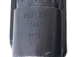 付属のマガジンはリブのないタイプで、「M.P.38u.40」及びで電気ペンによる4488の文字が入っており、背面には1940年エルマ社製を示す「27 40」の刻印が入っています。 やや小傷や擦れ、表面錆痕が見られるものの、大きな変形等は見受けられず、表面仕上げも比較的残っています。 尚、マガジン・スプリングは入っています。