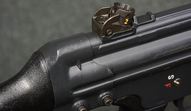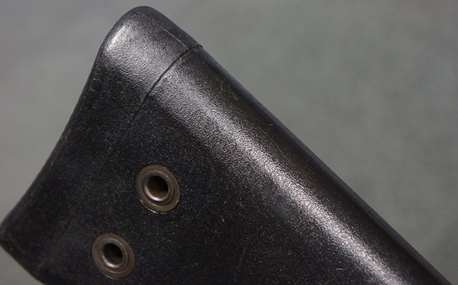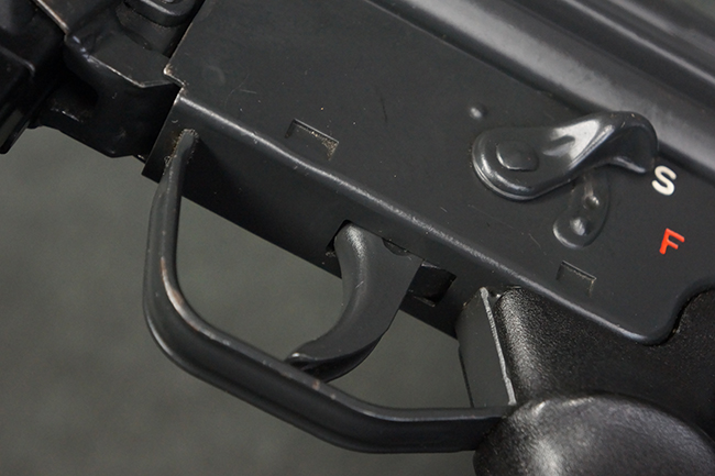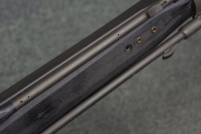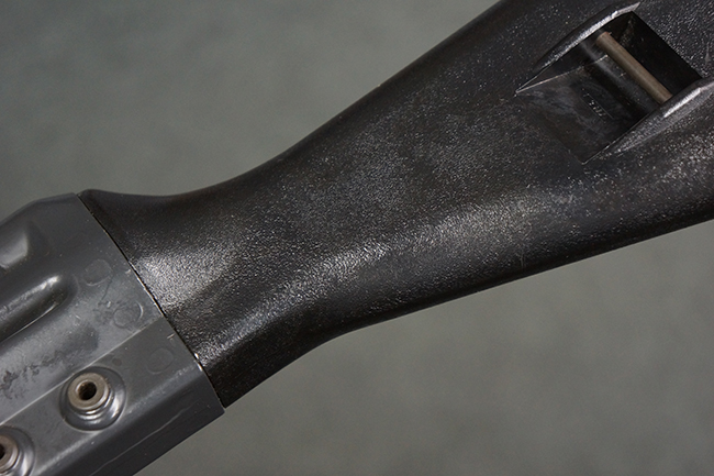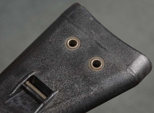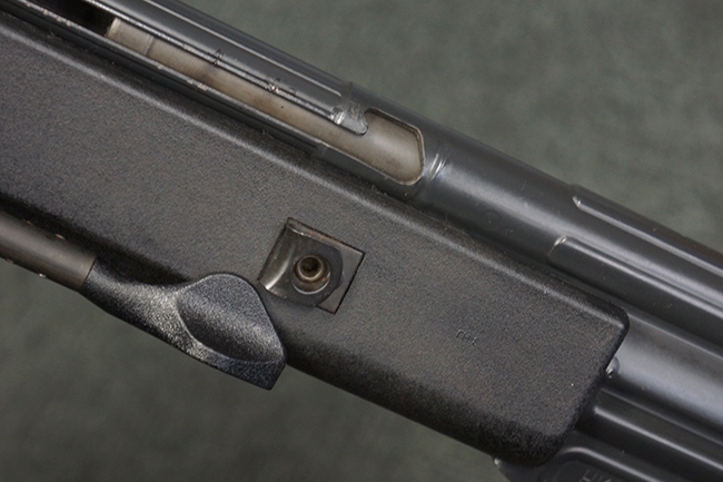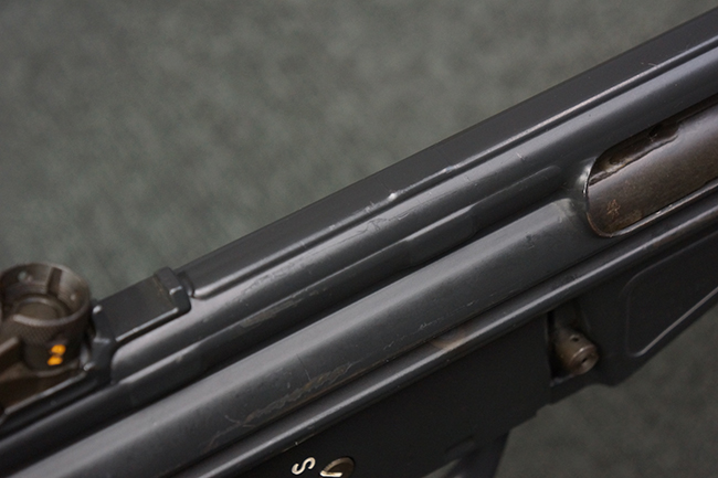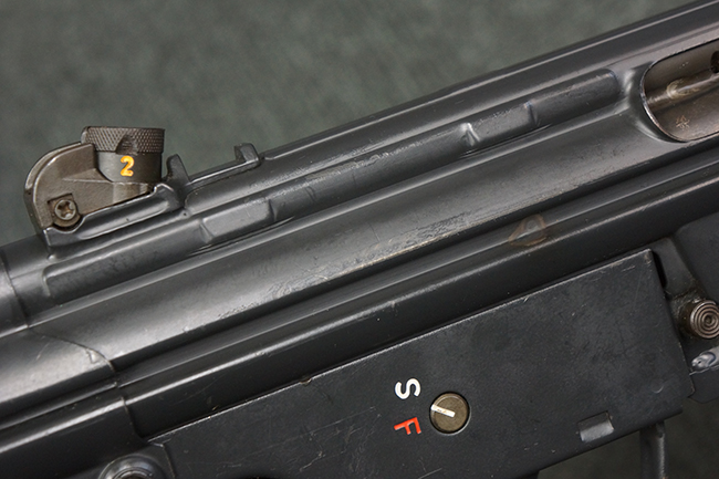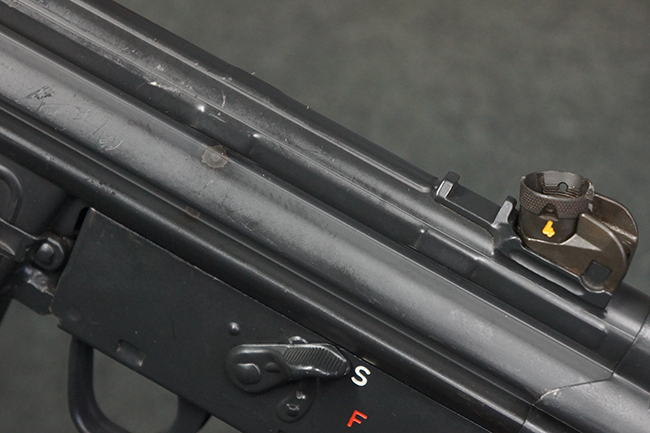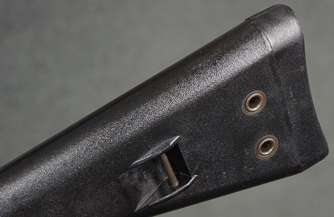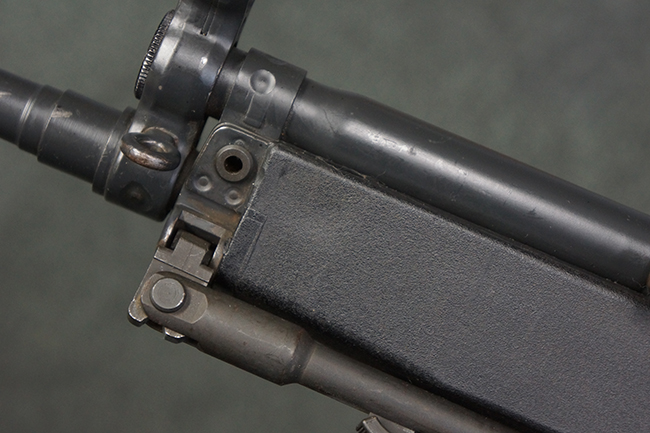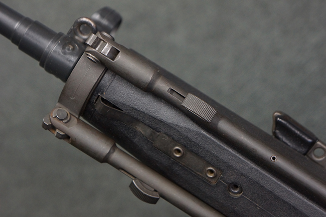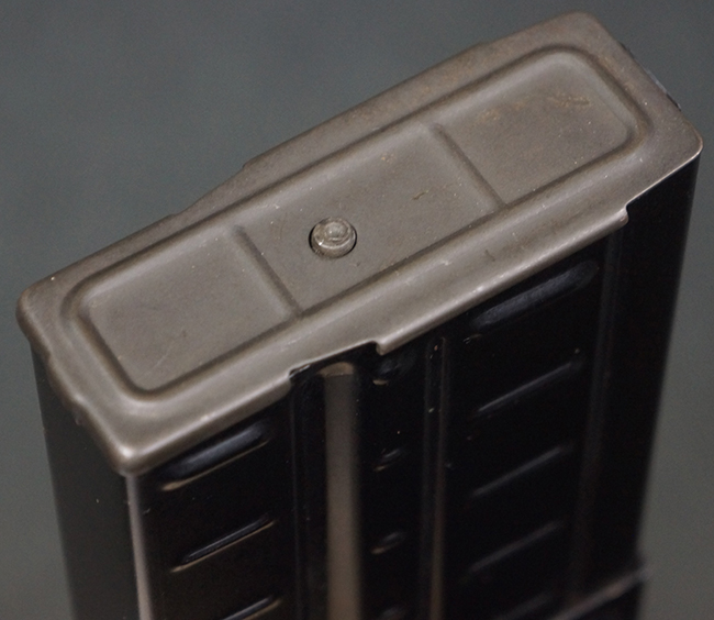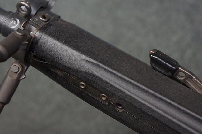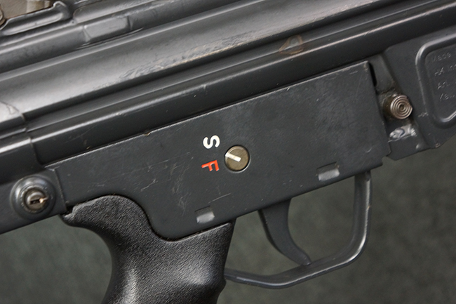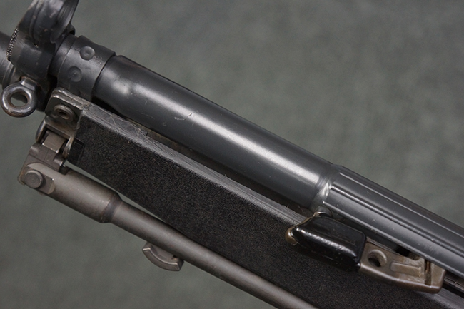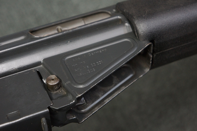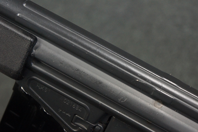 本品の銃身や機関部といった金属部は、若干の打ち傷や擦れ、一部塗装の剥落は見られるものの、目立った欠損等は見られず、オリジナルの焼き付け塗装仕上げも概ね良好に残っています。 樹脂製のハンドガードやグリップ、バット・ストックについても、若干の打ち傷や擦れは見られますが、こちらも大きな破損等は見られず、比較的良好な状態が保たれています。 傷み易いバット・プレートについては、やや打ち傷や擦れが見られる他、上部にヘアライン・クラックが見られますが、強度的には現状しっかりとした状態が保たれています。 リア・サイトの調整やマガジンの着脱、二脚の展開操作については問題なく行う事が可能です。 セーフティ・レバーの切り替えについても問題なく、安全位置でトリガーがロックされます。 付属のアルミ製マガジンは「G3 HK 5/76」の刻印が入ったHK社製で、若干の擦れに加えて一部に凹みが見られますが、大きな変形等は見られず、比較的良好な状態が保たれています。 尚、マガジン・スプリングは入っています。