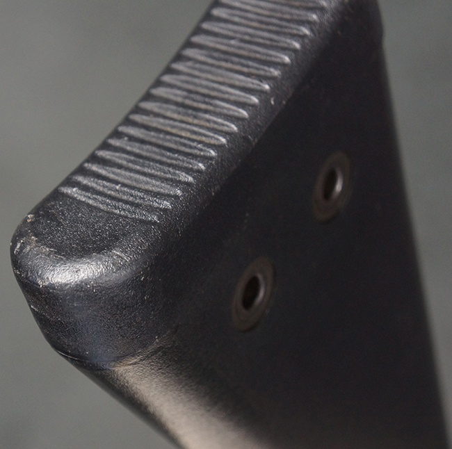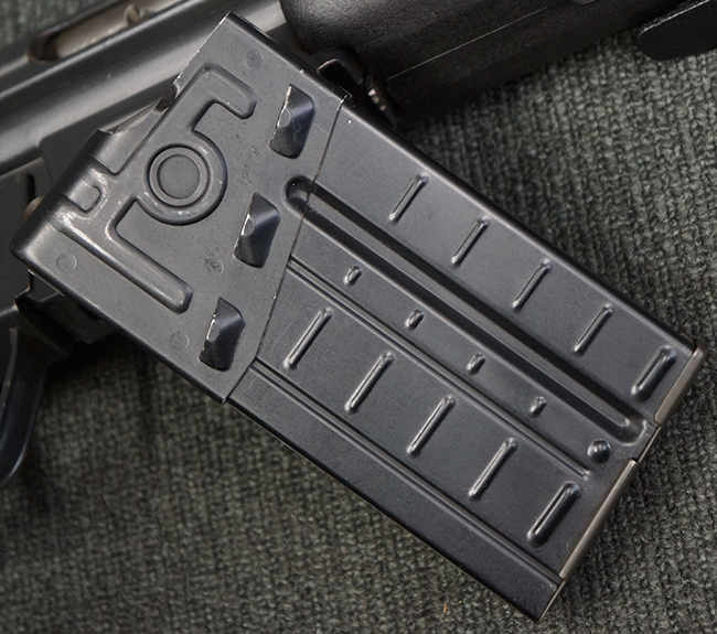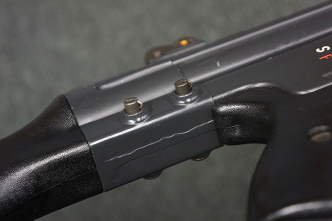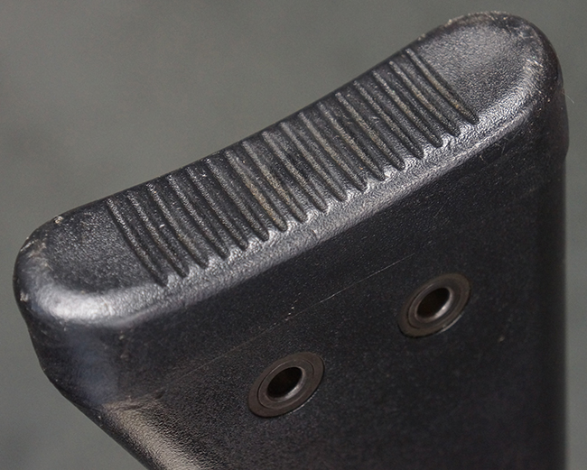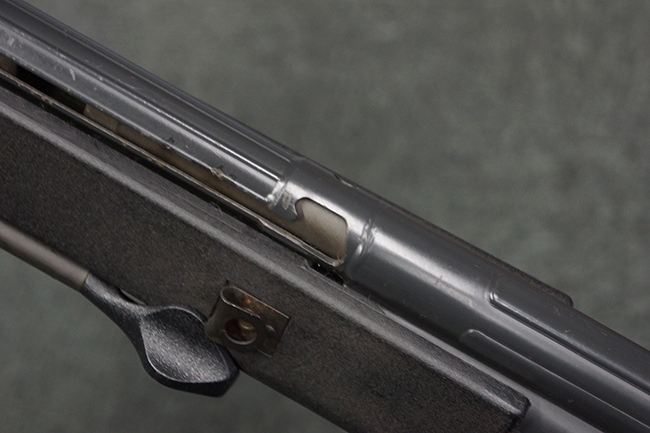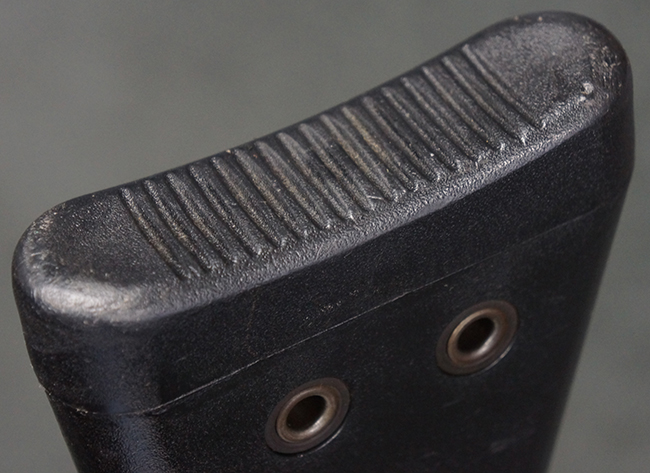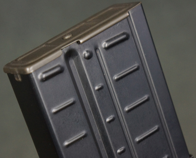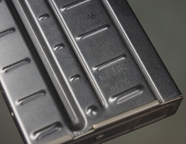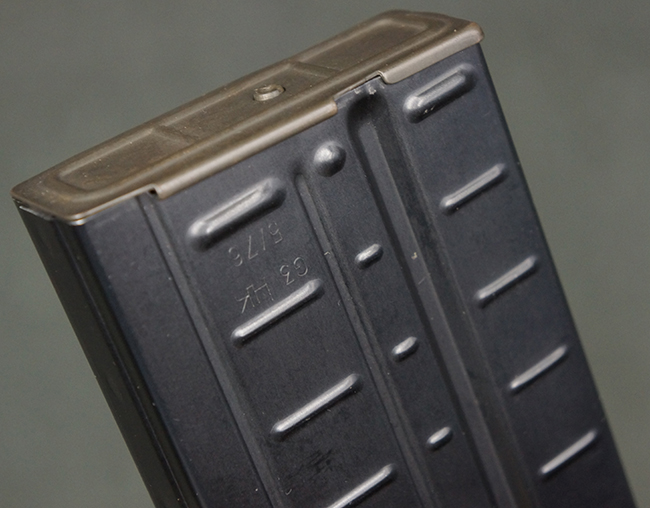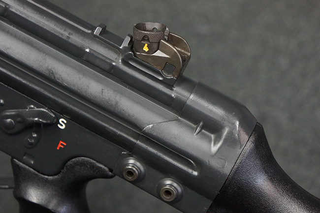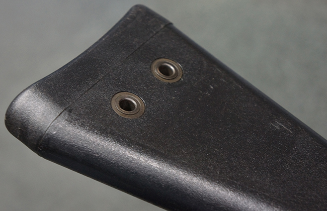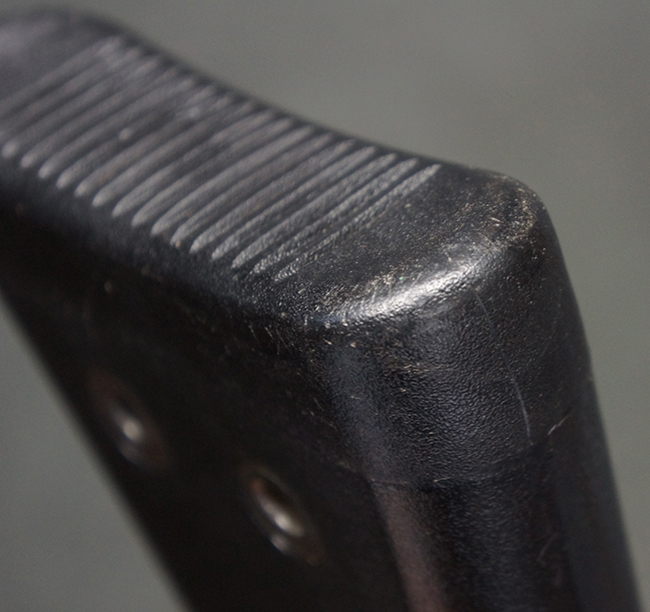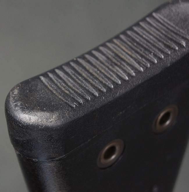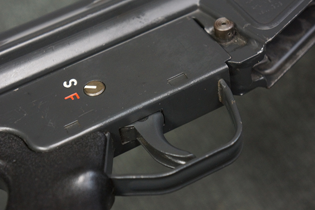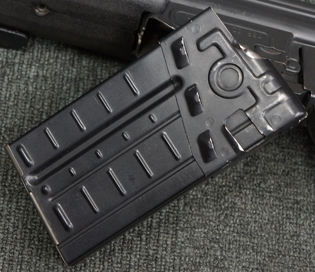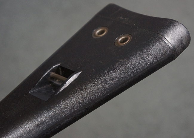 本品の銃身や機関部といった金属部は、若干の打ち傷や擦れ、一部塗装の剥落は見られるものの、目立った欠損等は見られず、オリジナルの焼き付け塗装仕上げも概ね良好に残っています。 樹脂製のハンドガードやグリップ、バット・ストックについても、若干の打ち傷や擦れは見られますが、こちらも大きな破損等は見られず、比較的良好な状態が保たれています。 傷み易いバット・プレートについては、やや打ち傷や擦れが見られる他、上部にヘアライン・クラックが見られますが、強度的には現状しっかりとした状態が保たれています。 リア・サイトの調整やマガジンの着脱、二脚の展開操作については問題なく行う事が可能です。 セーフティ・レバーの切り替えについても問題なく、安全位置でトリガーがロックされます。 付属のアルミ製マガジンは「G3 HK 5/76」の刻印が入ったHK社製で、若干の擦れに加えて一部に凹みが見られますが、大きな変形等は見られず、比較的良好な状態が保たれています。 尚、マガジン・スプリングは入っています。