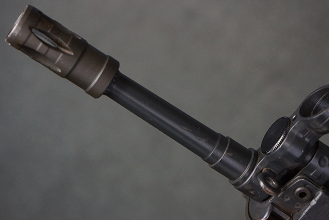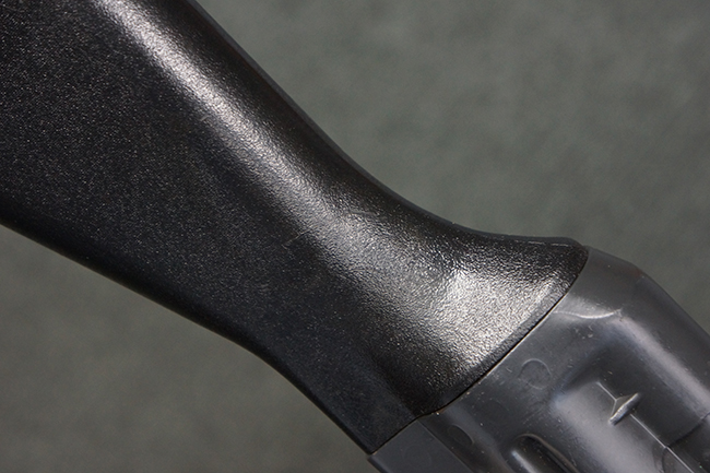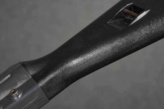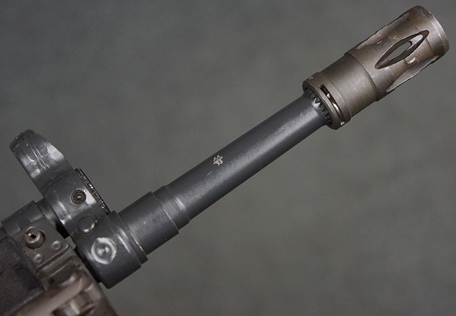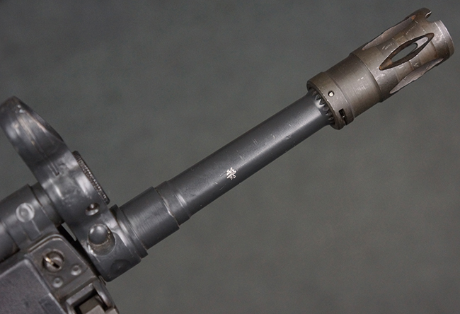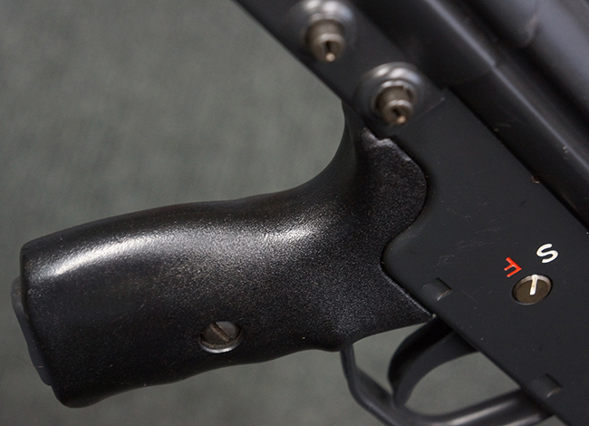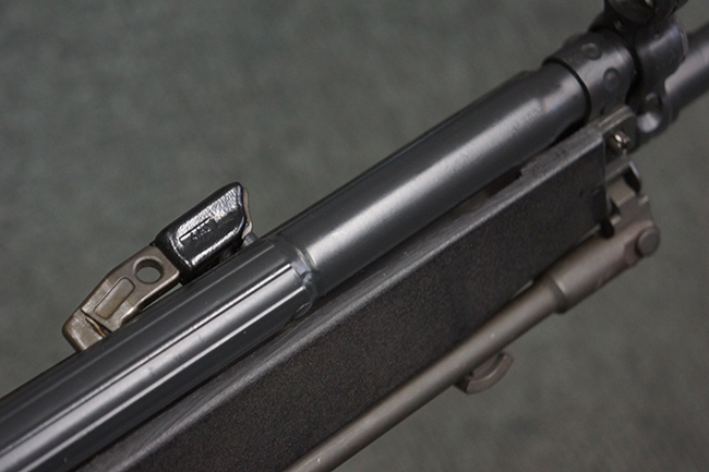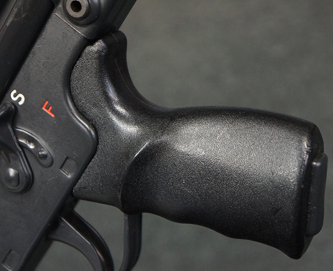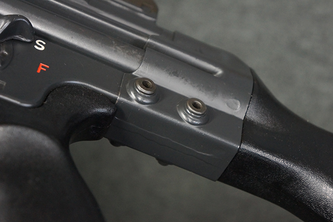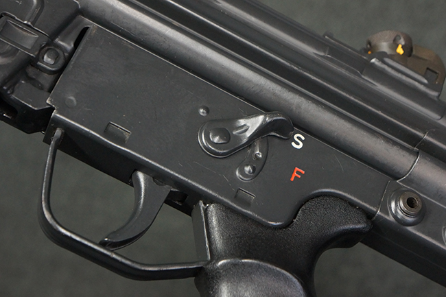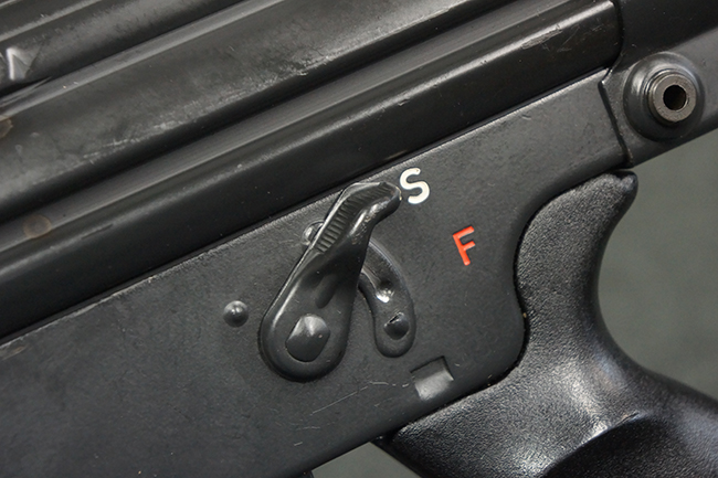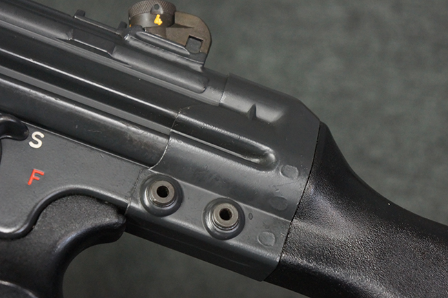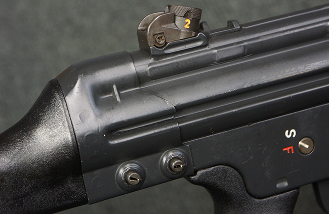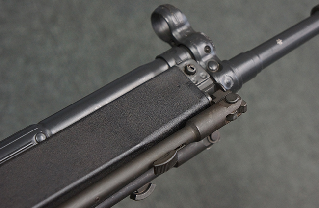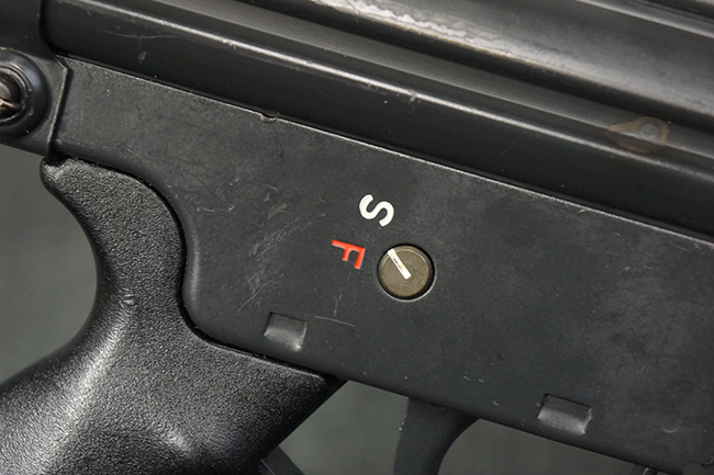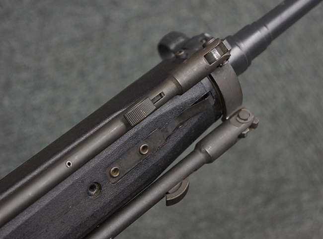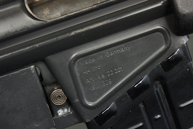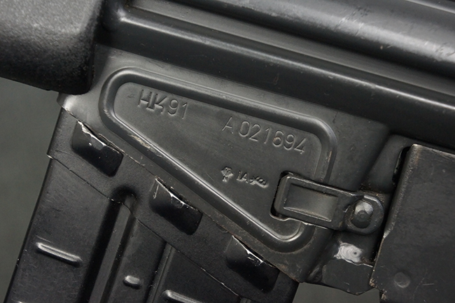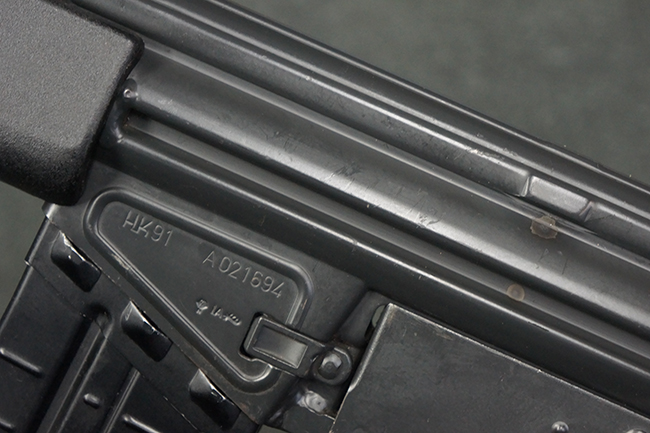 本品のマガジン・ハウジング左側面には、「HK91」のモデル名やシリアルNo.の他、「連邦共和国の鷲」と「N」を組み合わせた最終検査刻印や検査年を示す刻印、ドイツのHK社所在地であるバーデン=ヴュルテンベルク州オーベルンドルフを管轄するウルム (バーデン=ヴュルテンベルク州南部) のプルーフ・ハウス刻印が打刻されています。 また、マガジン・ハウジング右側面には「Made in Germany」の刻印に加えて、米国への輸入を行った「HK Inc. Arl. Va. 22201」の刻印や「Kal. .308」の口径表示刻印が打刻されています。 セレクターは「S (安全位置)-F (発射)」のアルファベット表記となっています。 本品のハンドガード、グリップ、バット・ストックは黒色の樹脂製で統一されています。 ハンドガードはワイド・タイプで、折り畳み式の二脚が付属いたします。 二脚は先端の石突部が樹脂製となったポリス・タクティカル・タイプとなっています。