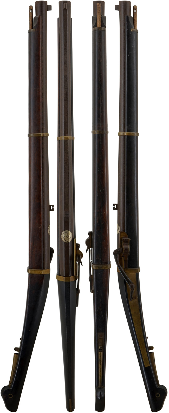台木 (銃床) については銘を入れるだけあって、台師にとっても自信作であったと思われます。 台木にはやや打ち傷や線傷が僅かに散見されますが、全く問題の無いレベルです。 銃身を外して台(銃床)の状態を見ると使用(実射)された形跡が殆どなく、160年以上経た時代感は感じられますが、しっかりとした状態が保たれています。 先台全体に角は完全に落とした丸みを帯びた形状です。 カラクリの地板や胴金、雨覆、火蓋、引金、ナマコ金といった真鍮部品についても、適度な時代感が付いた良い雰囲気となっています。 カラクリの作動については完全で、鉄製の火挟を起こした際のロックはしっかりと掛かり、引金を引くと火挟がスムーズに落ちます。 火蓋の開閉についても問題なく行うことが可能です。 銃身内は銃口から銃身後部まで完全に抜けて (通って) おり、火穴も抜けています。 尾栓については現状固着しており取り外しは出来なくなっています。 木製のかるか (さく杖) が付属致します。