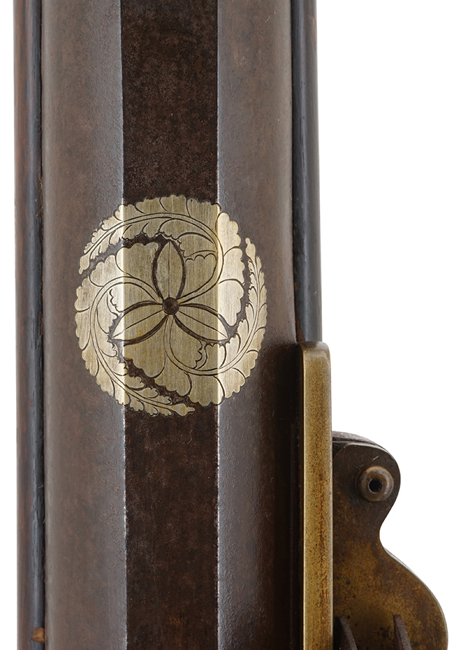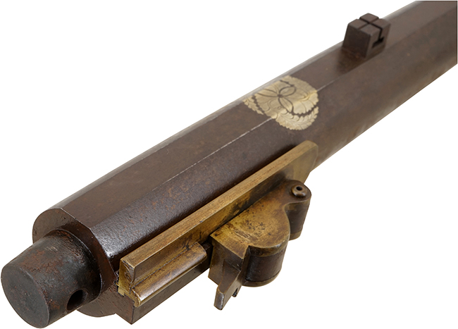 本品は口径が実測17mmの八匁中筒で、本体重量は約◯◯kgとなっています。 本品の筒 (銃身) は後方に向かって緩やかに広がった丸銃身で、上面のみ平坦となった「表一角」と呼ばれる形状となっています。 銃身の上には作域の良い銀象嵌で「三ツ藤巴紋(みつふじどもえもん)」または「藤巴紋」が配されいます。 後藤又兵衛、大久保利通、福岡藩主黒田家の家紋などで有名です。 銃身と銃床は目釘ではなく1本の真鍮製台締金により確りと固定される構造となっています。