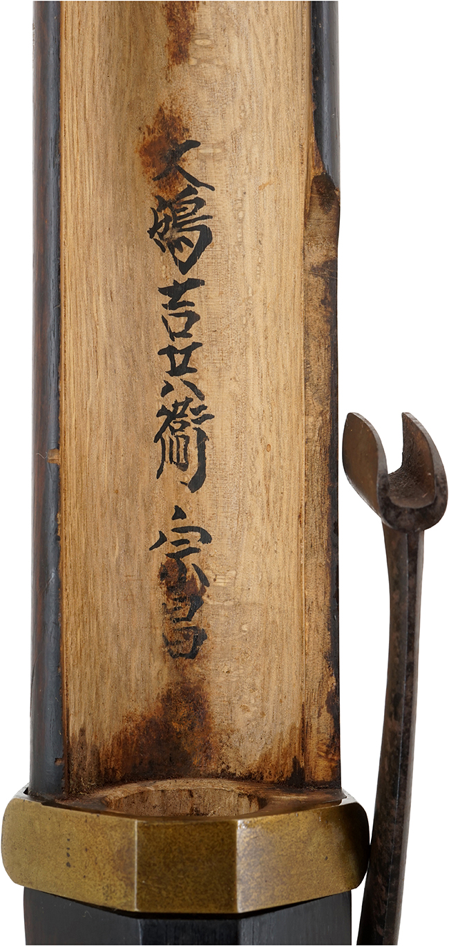 台木 (銃床) についても高級な樫を用いるなど贅沢な材料を使った品で、内部には「大嶋吉兵衛宗昌」の台師銘が入っています。 弊社では「大嶋吉兵衛宗昌」の銘が入った台木が付いた「摂州住嶌谷喜八郎」作の火縄銃 細筒と「江州國友戸十郎當節」作の火縄銃型 管打式軍用筒も取り扱っており、大嶋吉兵衛宗昌が堺及び江州国友の鉄砲鍛冶双方に台木を供給していた事が窺えます。 尚、國友戸十郎當節については文政七年 (1824年) から幕末頃にかけて活動していた鉄砲鍛冶である事から、同じ台師銘が入った本品の台木も同時期に製作された可能性が高いと思われます。 豪華絢爛な堺筒の台木から、装飾性を廃した質実剛健な国友軍用筒の台木まで幅広く手掛けていた大嶋吉兵衛宗昌は、当時相当の実力や技巧を備えた台師であったと考えられます。