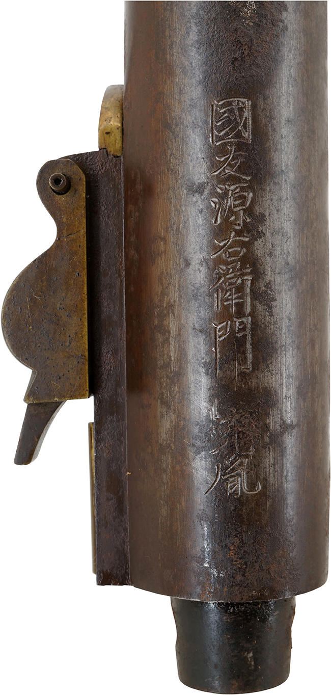 江州国友鍛冶の名工である「國友源右衛門充胤 (全国鉄砲鍛冶銘鑑記載銃工)」の在銘中筒です。 充胤は江戸時代の天才発明家、国友一貫斎藤兵衛の実弟である八代目国友源右衛門の子で、九代目国友源右衛門です。 國友源右衛門充胤の銘は、「全国鉄砲鍛冶銘鑑」P.108及び「全国鉄砲鍛冶銘地域別分類」P.100に掲載されています。 充胤は明治十九年(1886年)没で、江戸時代後期から幕末に活躍した鉄砲鍛冶です。 充胤の初期の作として、弘化二年(1844年)の年紀が入った非常に良く似た作が残されており、本作も弘化年間(1844年-1848年)から嘉永年間(1848年-1855年)頃に作られた品と考えられます。