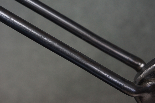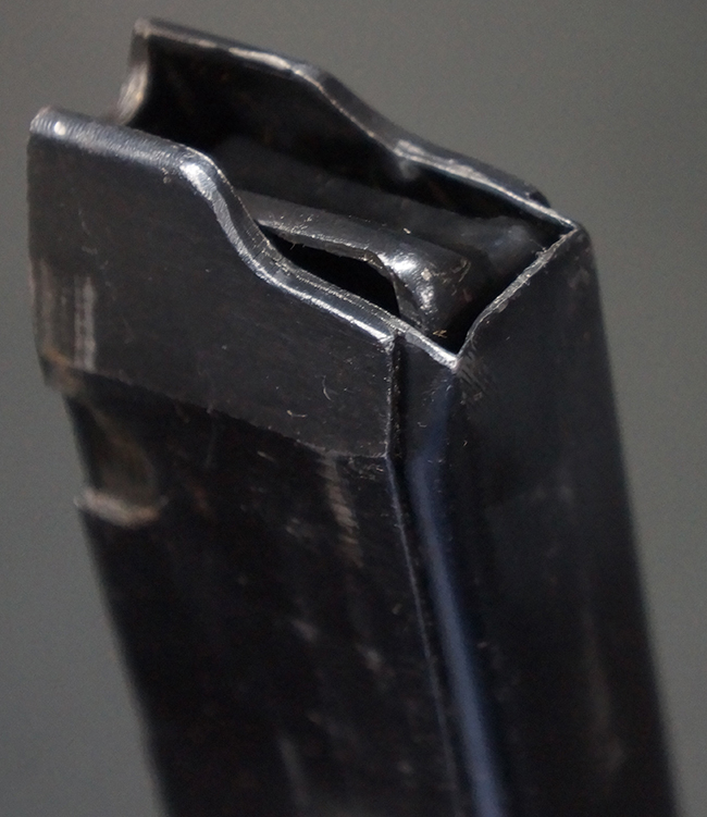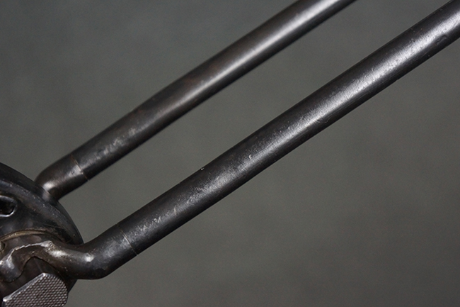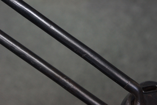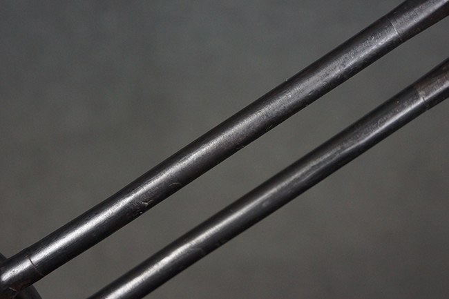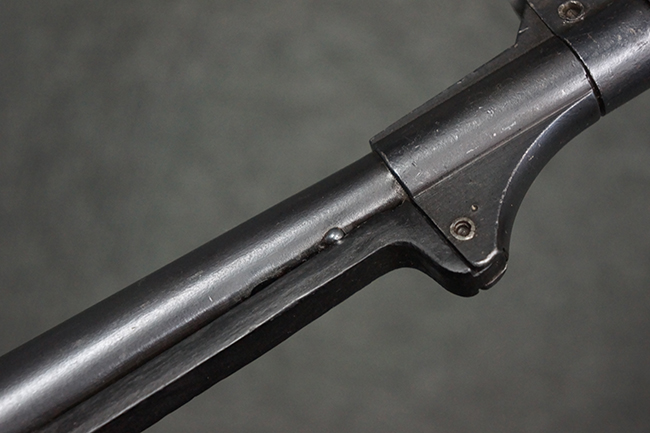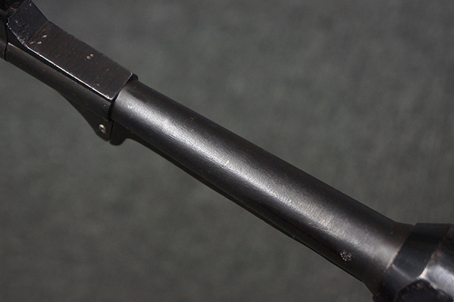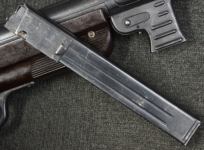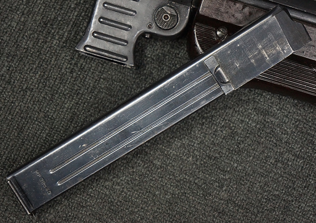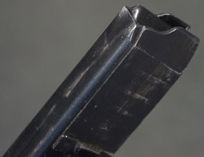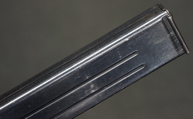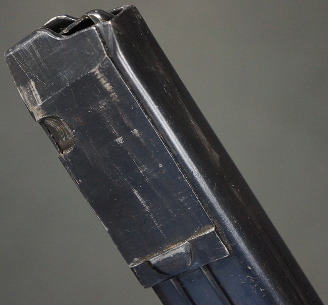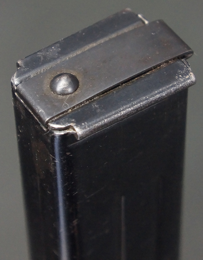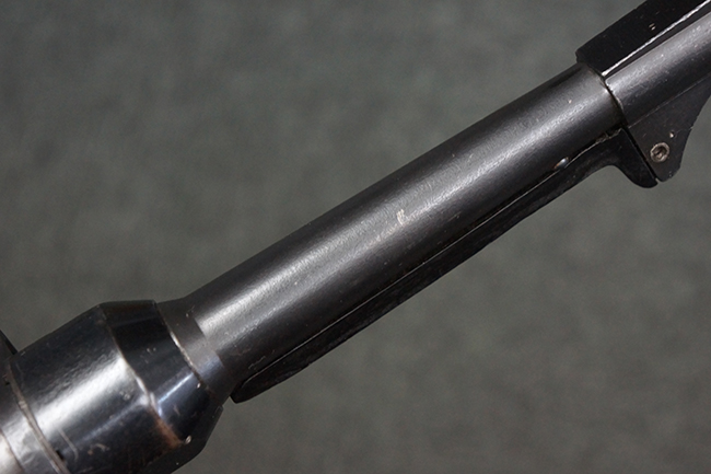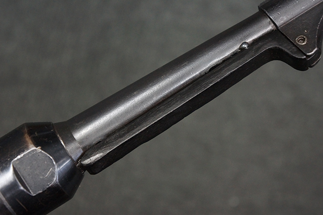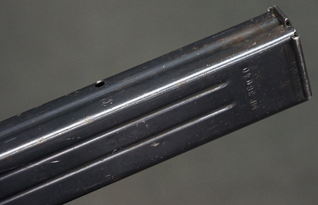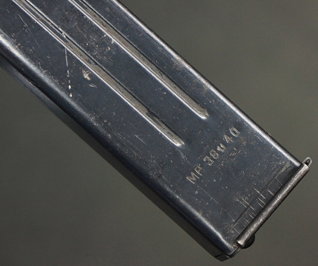本品の機関部や銃身といった金属部は、やや打ち傷や擦れ、経年による褪色の他、一部に表面錆痕や仕上げが落ちて金属の地肌が表れている箇所が見られるものの、現状目立った欠損等は見受けられず、概ねしっかりとした状態が保たれています。 樹脂製のハンドガードやグリップ・パネル、バレル・レストについては、やや打ち傷や線傷等は見られるものの、大きな破損等は見られず、比較的良好な状態が保たれています。 アッパー・レシーバーとロア・レシーバーの取り付けについては、がたつき等は殆ど見られません。 マガジンの着脱やリア・サイトの切り替え、ストックの展開・折り畳み操作については問題なく行う事が可能です。 マガジンは取り付け時に前後に若干の遊びが見られますが、固定自体はしっかりとしています。 ストックは展開時及び折り畳み時にやや遊びが見られますが、ロックはしっかりと掛かります。 付属のマガジンには「M.P.38 u 40」及び1942年Frank'sche Eisenwerke AG製を示す「bte 42」の刻印が入っており、やや打ち傷や擦れ、経年による褪色や若干の表面錆痕は見られるものの、大きな凹みや変形は見られず、概ねしっかりとした状態が保たれています。 尚、マガジン・スプリングは入っています。