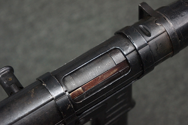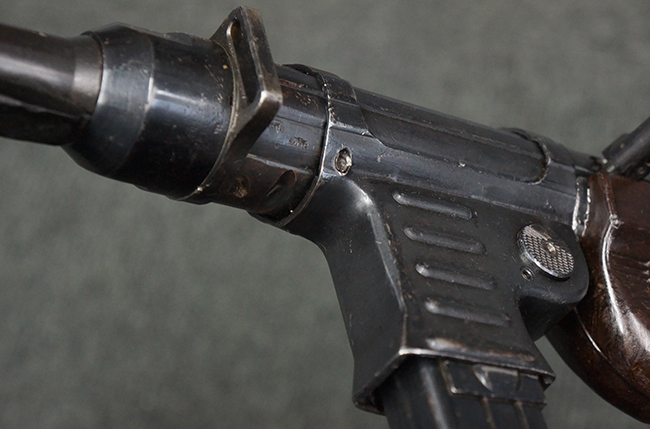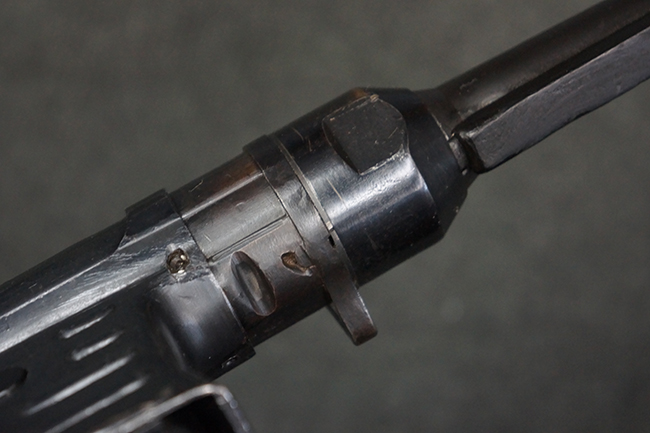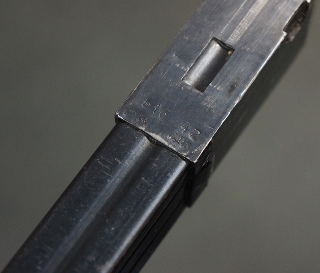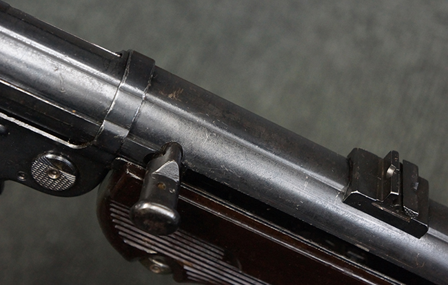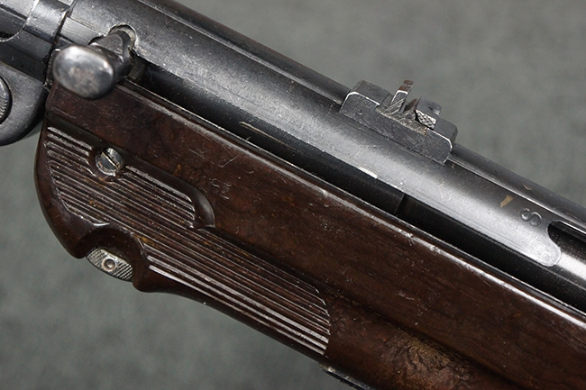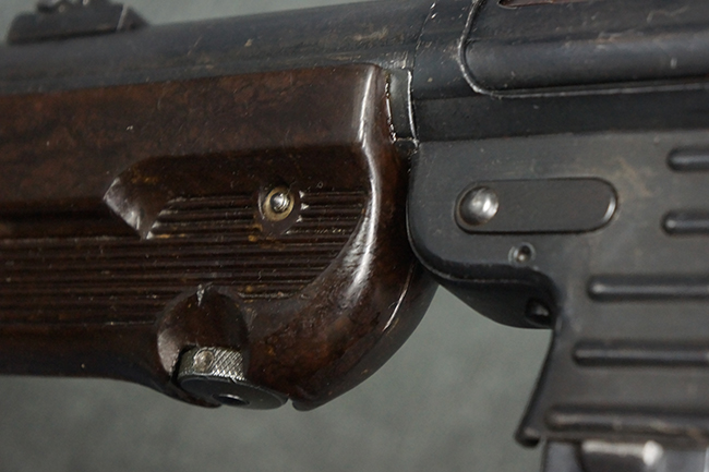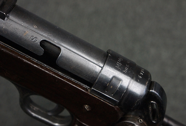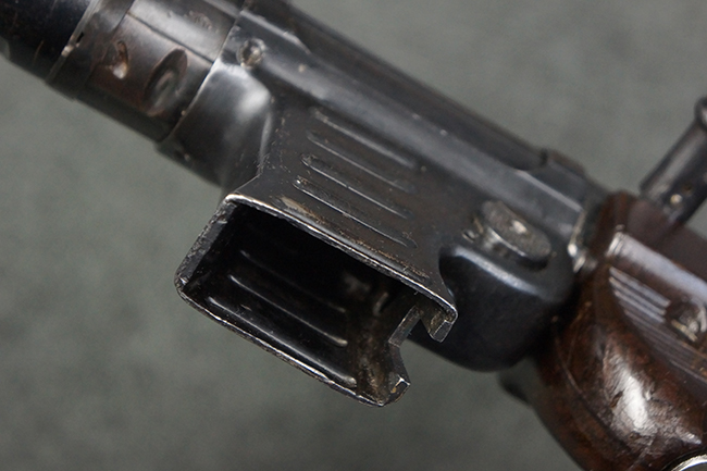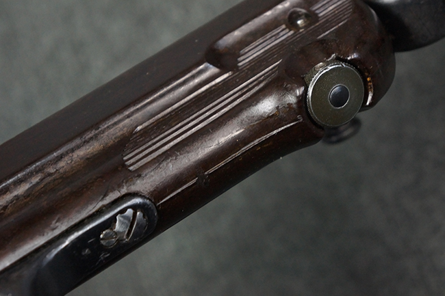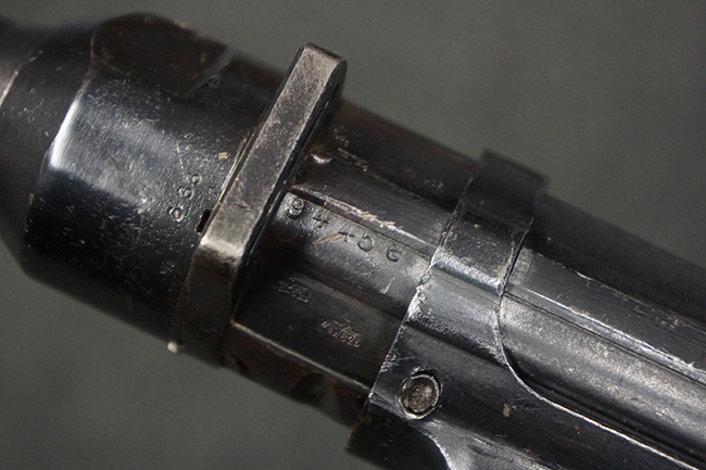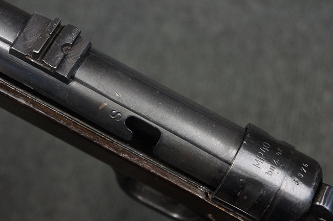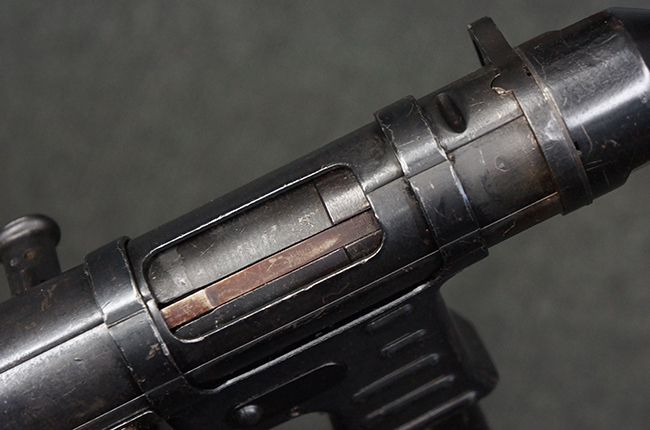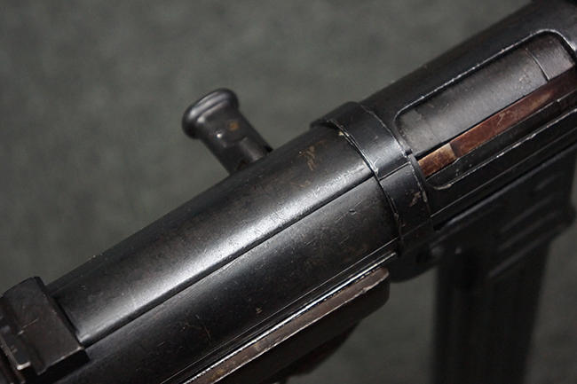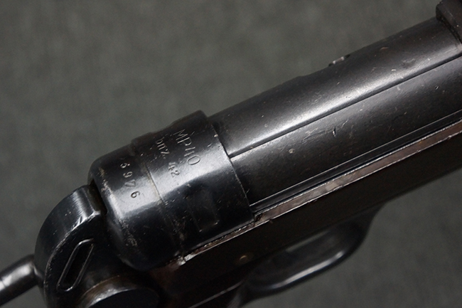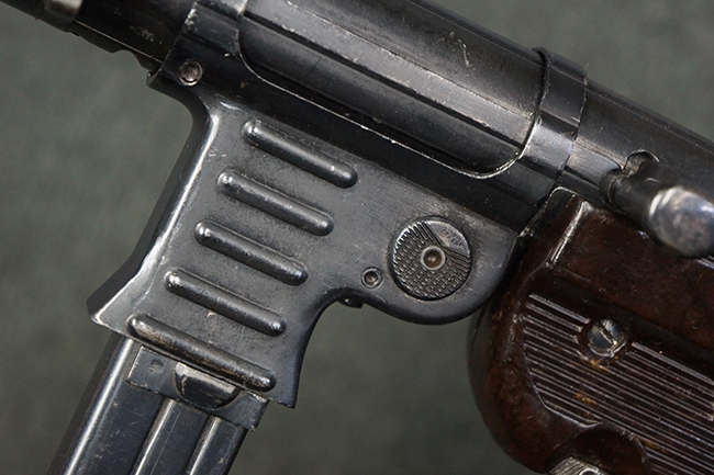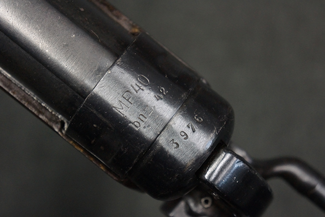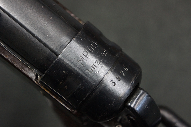 本品のレシーバー・エンド・キャップ上面には「MP40」のモデル名に加えて、1942年ステアー社製を示す「bnz 42」の刻印が入っています。 レシーバー・エンド・キャップのシリアルNo.は3976、アッパー・レシーバーのシリアルNo.は9445eとなっています。 マガジン・ハウジングは両面に5本の強化リブが追加されたタイプとなっています。 その他のシリアルNo.については、フロント・サイト・ガードが103、リア・サイトが445、リコイル・スプリング・チューブが354、ストックが667となっています。 尚、フロント・サイト・ベースにはハーネル社製を示す「fxo」のコードが打刻されています。 グリップ・フレームはプレス製で一体製造したものを左右貼り合わせたタイプで、トリガー・ガードも従来型と比べてより厚みのある形状となっています。 マズル・リングは後期型の中央に溝のあるH型、バレル・ナットは平面部分が2箇所のみのタイプ、バレル・レストは樹脂製となっており、コッキング・ハンドルは1942年半ば以降に本格的に導入されたボルト・セーフティ機能を備えた2ピース・タイプが装備されています。