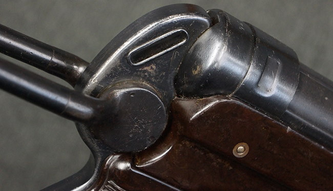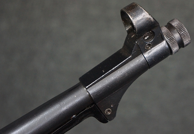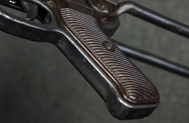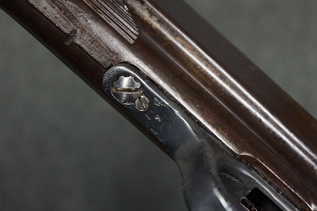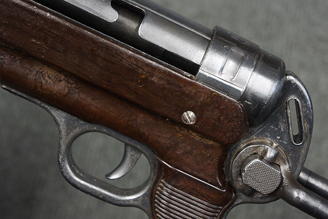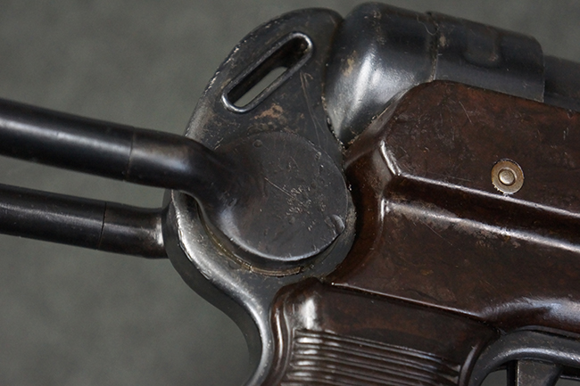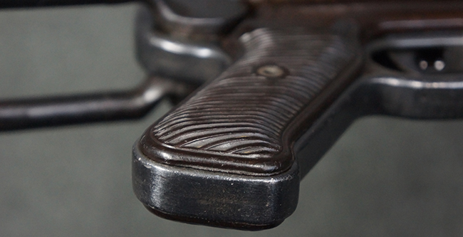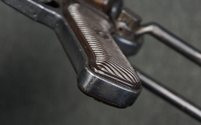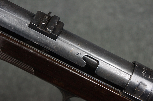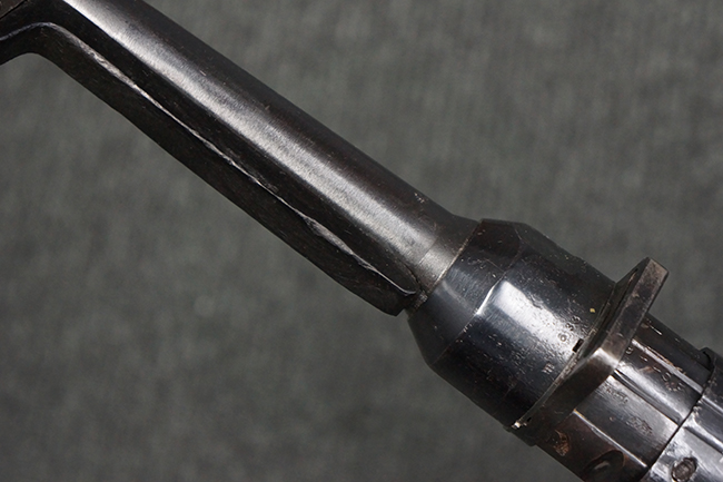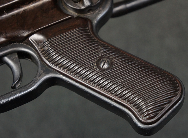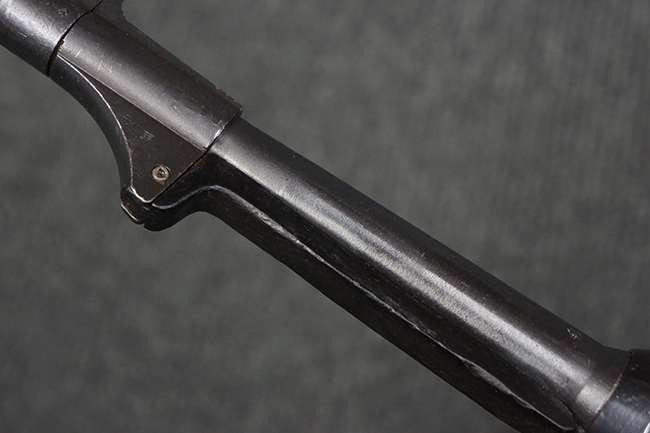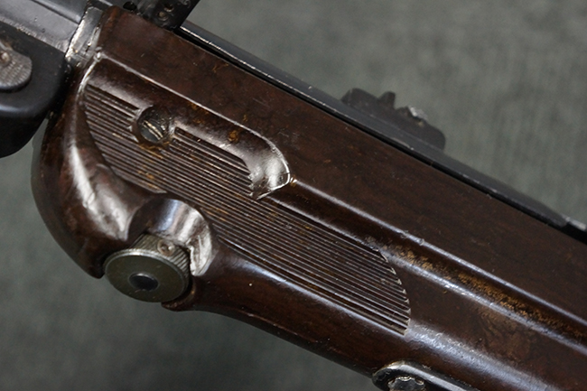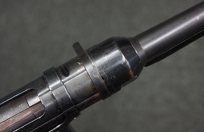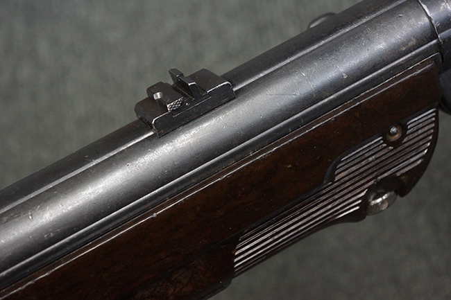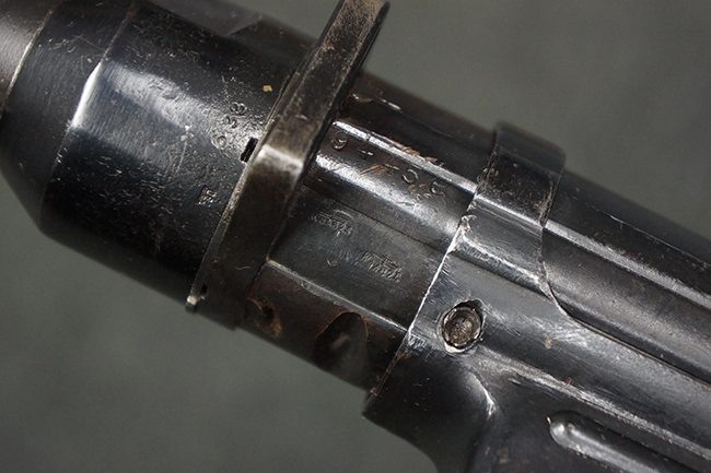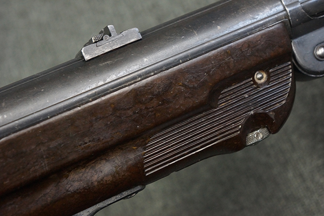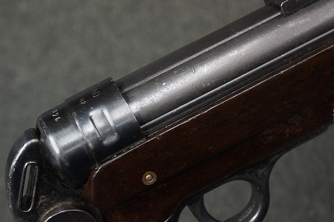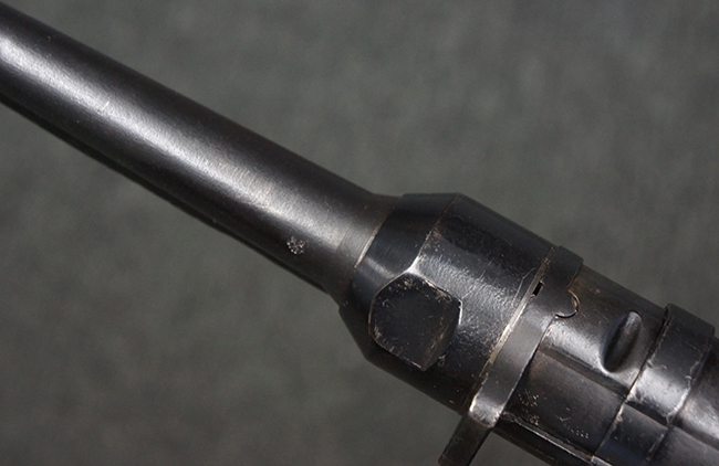 本品のレシーバー・エンド・キャップ上面には「MP40」のモデル名に加えて、1942年ステアー社製を示す「bnz 42」の刻印が入っています。 レシーバー・エンド・キャップのシリアルNo.は3976、アッパー・レシーバーのシリアルNo.は9445eとなっています。 マガジン・ハウジングは両面に5本の強化リブが追加されたタイプとなっています。 その他のシリアルNo.については、フロント・サイト・ガードが103、リア・サイトが445、リコイル・スプリング・チューブが354、ストックが667となっています。 尚、フロント・サイト・ベースにはハーネル社製を示す「fxo」のコードが打刻されています。 グリップ・フレームはプレス製で一体製造したものを左右貼り合わせたタイプで、トリガー・ガードも従来型と比べてより厚みのある形状となっています。 マズル・リングは後期型の中央に溝のあるH型、バレル・ナットは平面部分が2箇所のみのタイプ、バレル・レストは樹脂製となっており、コッキング・ハンドルは1942年半ば以降に本格的に導入されたボルト・セーフティ機能を備えた2ピース・タイプが装備されています。