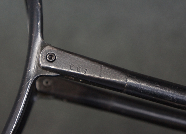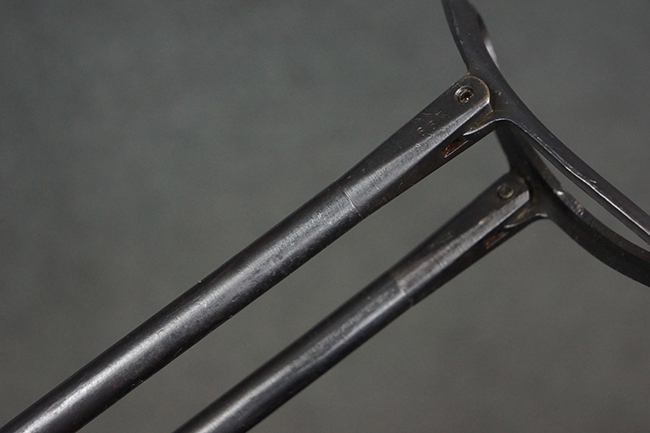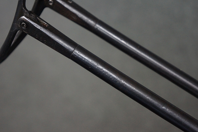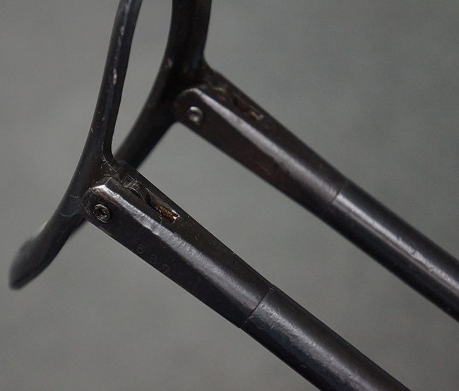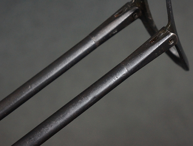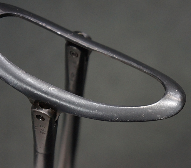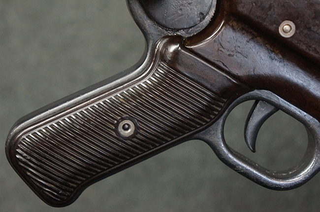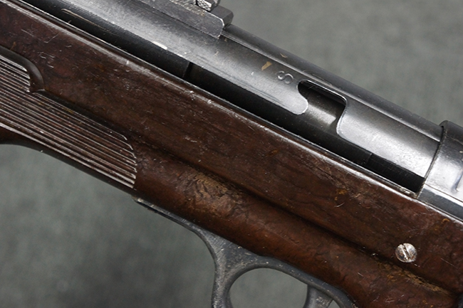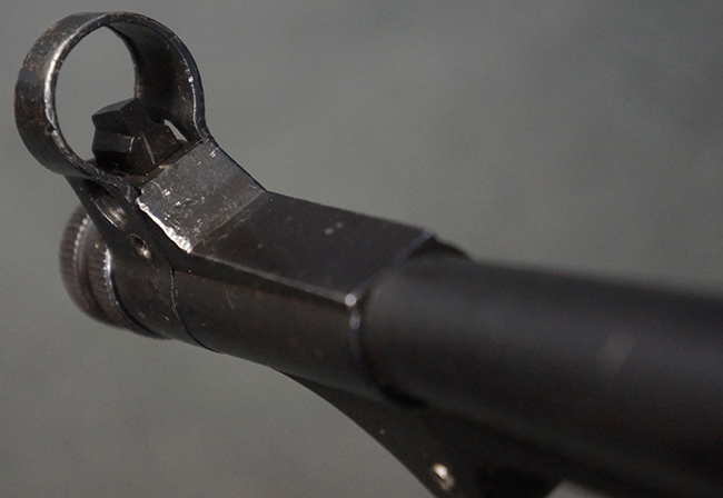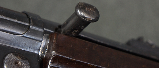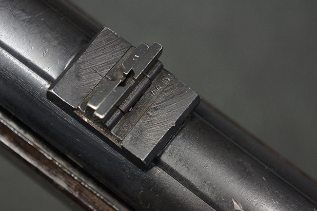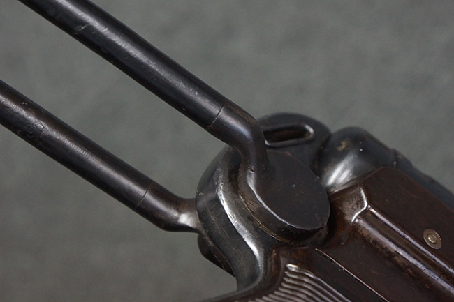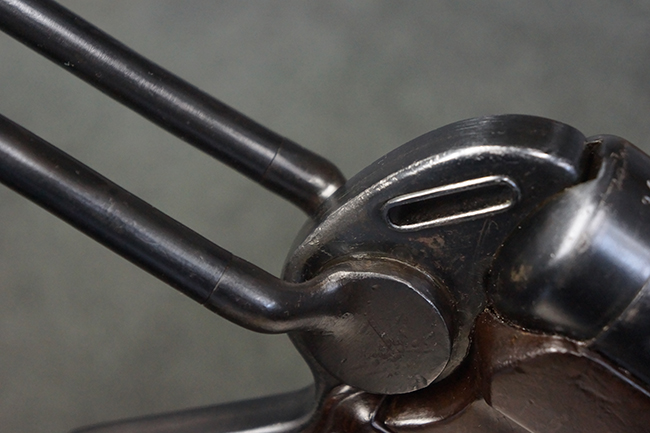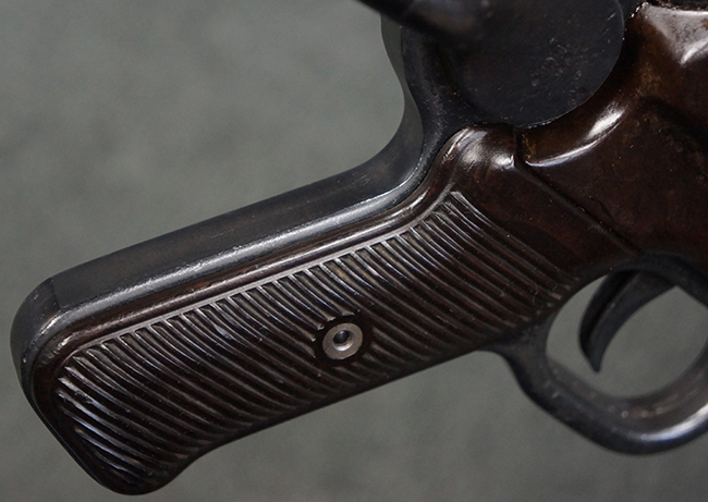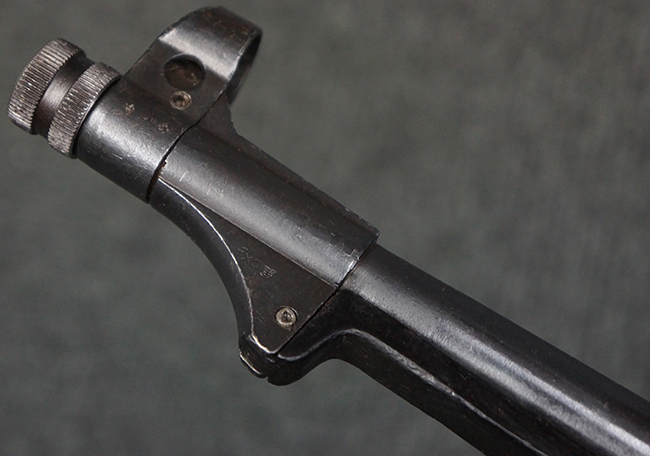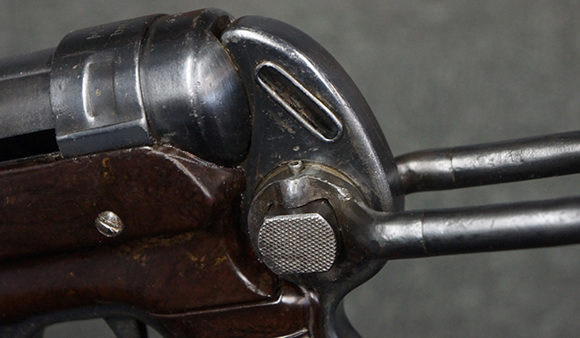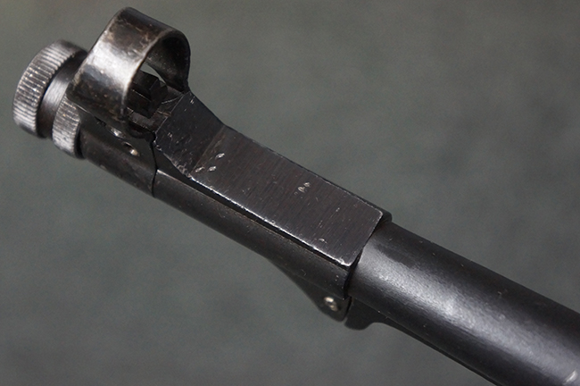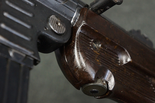 本品のレシーバー・エンド・キャップ上面には「MP40」のモデル名に加えて、1942年ステアー社製を示す「bnz 42」の刻印が入っています。 レシーバー・エンド・キャップのシリアルNo.は3976、アッパー・レシーバーのシリアルNo.は9445eとなっています。 マガジン・ハウジングは両面に5本の強化リブが追加されたタイプとなっています。 その他のシリアルNo.については、フロント・サイト・ガードが103、リア・サイトが445、リコイル・スプリング・チューブが354、ストックが667となっています。 尚、フロント・サイト・ベースにはハーネル社製を示す「fxo」のコードが打刻されています。 グリップ・フレームはプレス製で一体製造したものを左右貼り合わせたタイプで、トリガー・ガードも従来型と比べてより厚みのある形状となっています。 マズル・リングは後期型の中央に溝のあるH型、バレル・ナットは平面部分が2箇所のみのタイプ、バレル・レストは樹脂製となっており、コッキング・ハンドルは1942年半ば以降に本格的に導入されたボルト・セーフティ機能を備えた2ピース・タイプが装備されています。