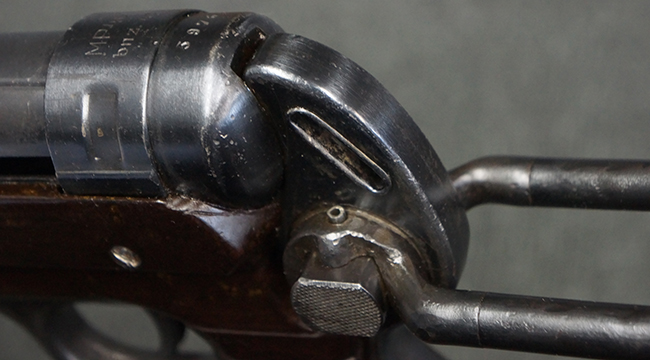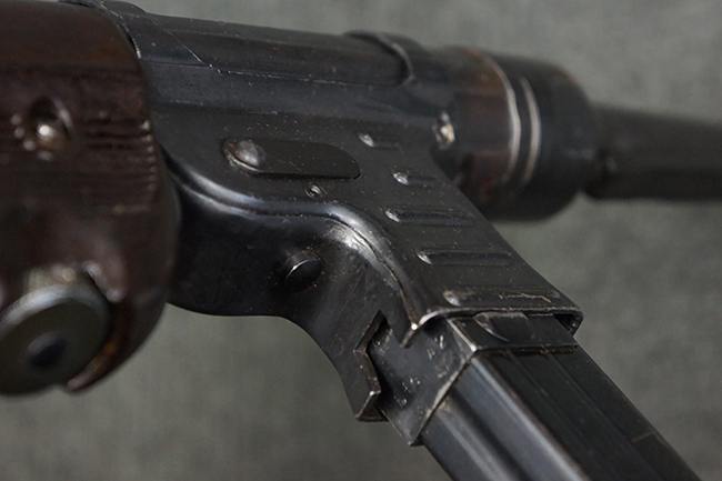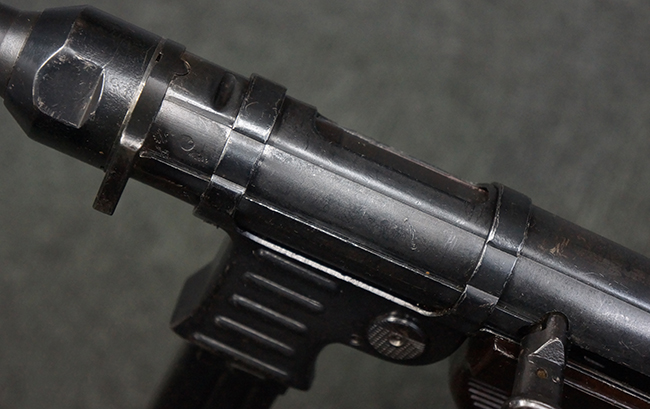 1943~1944年頃にステアー社で製造されたMP40短機関銃の最終型では、レシーバー・エンド・キャップとロア・レシーバーをプレスにより一体成型しているのが特徴です。 このタイプでは、プレスにより鋼板を折り込む方法でロア・レシーバー全体を成形しており、エンド・キャップ上面からロア・レシーバーの外縁部にかけて補強板のように見える板状の継ぎ目が見られます。 バレル・レストは1943年にエルマ社で製造されたタイプと同様にプレス製となっています。