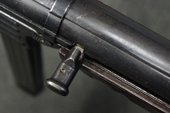MP38ではレシーバーを無垢の鉄材からの削り出しで製作していた他、グリップ・フレームが鋳造アルミ合金製でしたが、MP40では生産性を向上させるためにレシーバー及びグリップ・フレームに鋼板プレス加工を採用しました。 これにより製造工程が簡略化された他、ドイツ国内で調達が難しかったアルミニウムの節約にも繋がりました。 また、MP38ではマガジンに弾薬を装填した状態で銃を後部から落下させた際に、ボルトが前進位置から跳ね上がって暴発する危険性がありましたが、1940年後半にドイツの銃器設計者ヒューゴ・シュマイザーによってコッキング・ハンドルを内側に押し込む事によりボルトを閉鎖位置で固定するフォワード・ロック・セーフティが開発されました。 このセーフティ機能を備えた新たな2ピース型のコッキング・ハンドルは、1942年半ば以降に製造されたMP40から本格的に装備されるようになりました。