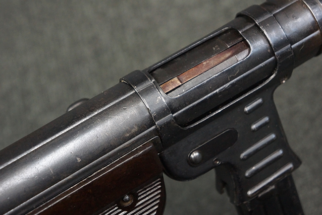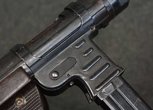 MP40のバリエーションの内、1941~1942年頃にエルマ社、ステアー社、ハーネル社で製造されたタイプは、マガジン・ハウジングの両側面に5本の強化リブが追加されているのが特徴で、これ以降に製造されたタイプでは全てマガジン・ハウジング表面にリブが追加されるようになりました。 グリップ・フレームは初期型と同様に前後二分割でプレス成型したものを溶接で組み合わせて製造されています。コッキング・ハンドルについては、1942年6月以降フォワード・ロック・セーフティ機能を備えたタイプの生産が本格的に開始された為、セーフティ機能付きのコッキング・ハンドルが付いた個体と初期型のフック型コッキング・ハンドルが付いた個体の両方が存在します。